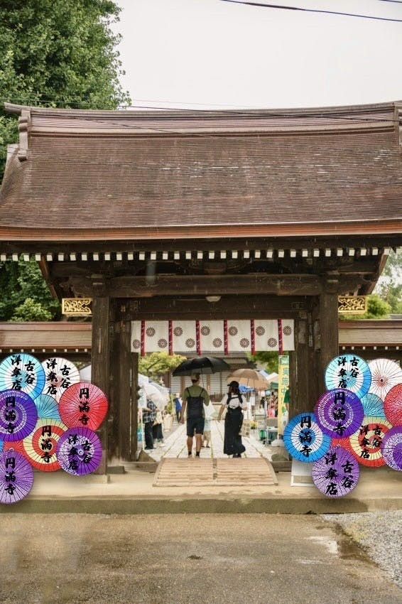 そんな歴史ある山門の前に番傘や蛇の目傘をあしらい、そこに3つのスポンサーの皆様のお名前や企業名を書道の得意なメンバーが大きく描かせて頂きます、また、さらに夜にはライトアップもさせて頂く予定です!