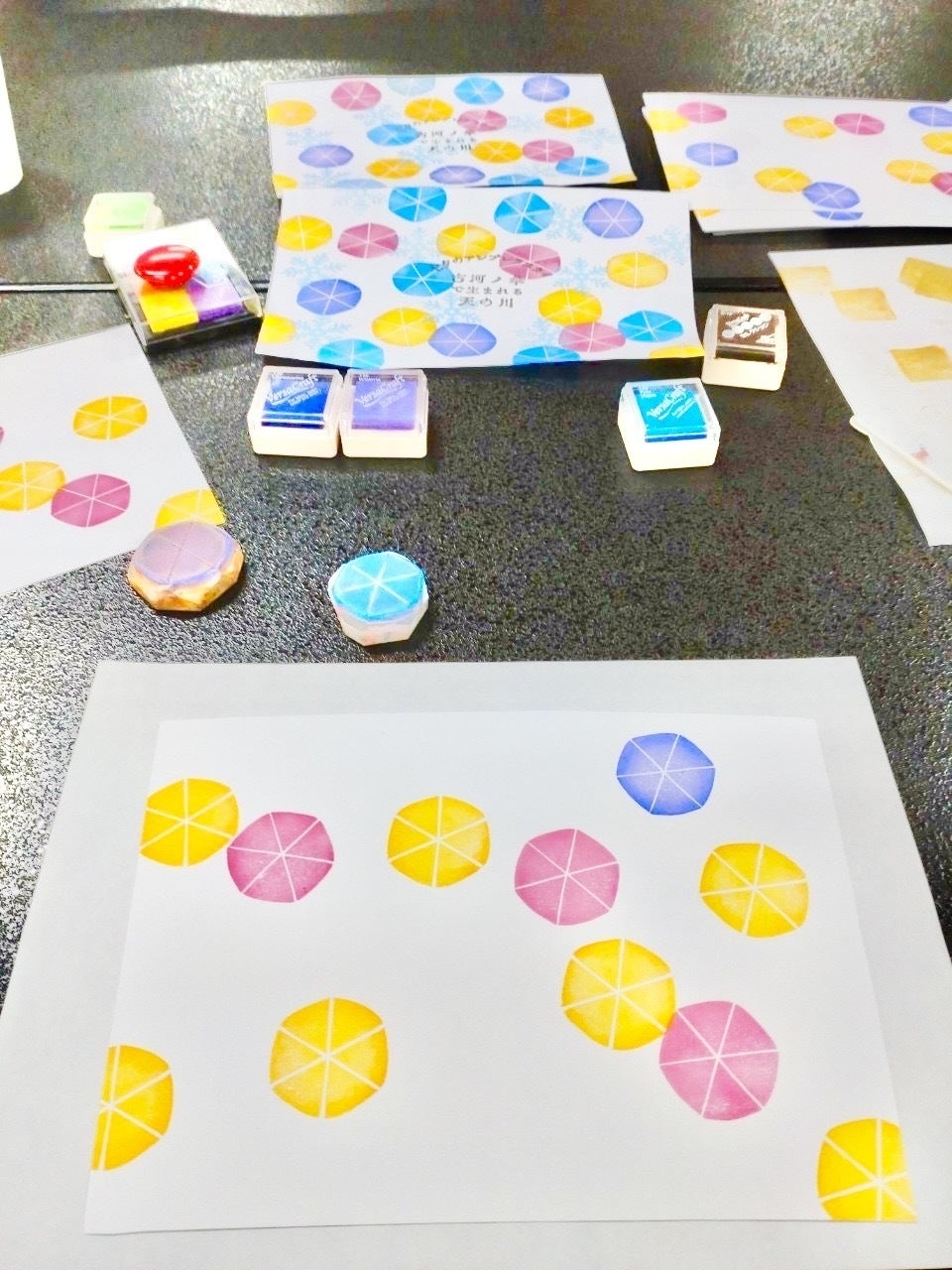 先日、はぴ育ママーズで決めたデザインと配色をもとに、消しゴムはんこ作家@junko.t.k さん(じゅんこ先生)に教えていただいた押し方を思い出しながら、1点1点制作しております。