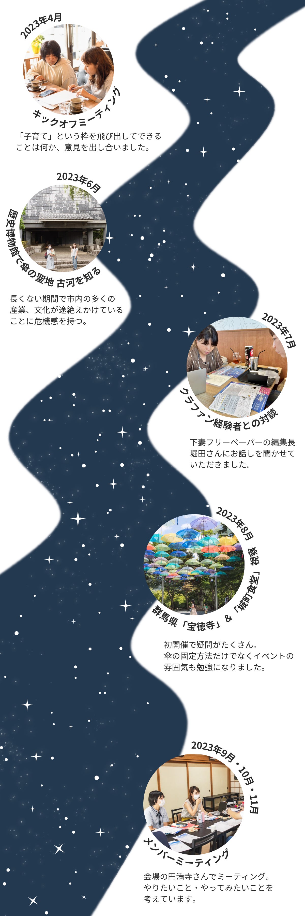 この町で子どもを育てる私たちにできることは何だろう?と考え、「アンブレラスカイを通して古河市の傘文化を掘り起こし、まだまだ知られていない魅力を掘り起こして伝えよう」とプロジェクトをスタートしました。