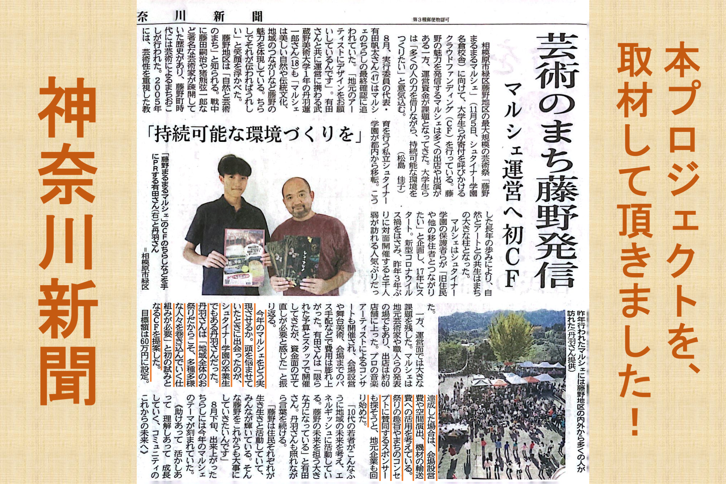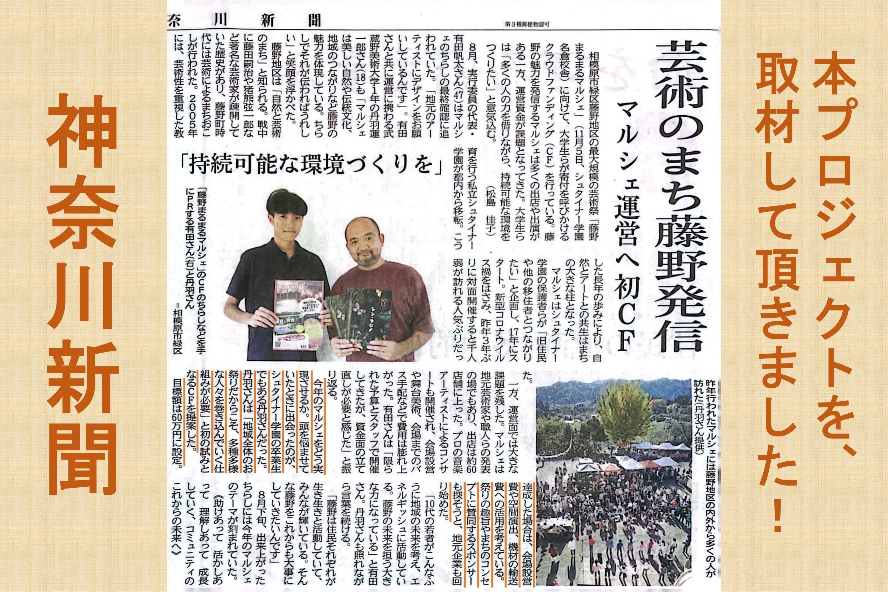 9月7日朝刊の神奈川新聞で、「藤野まるまるマルシェ」と本プロジェクトについて取材をして頂きました。
