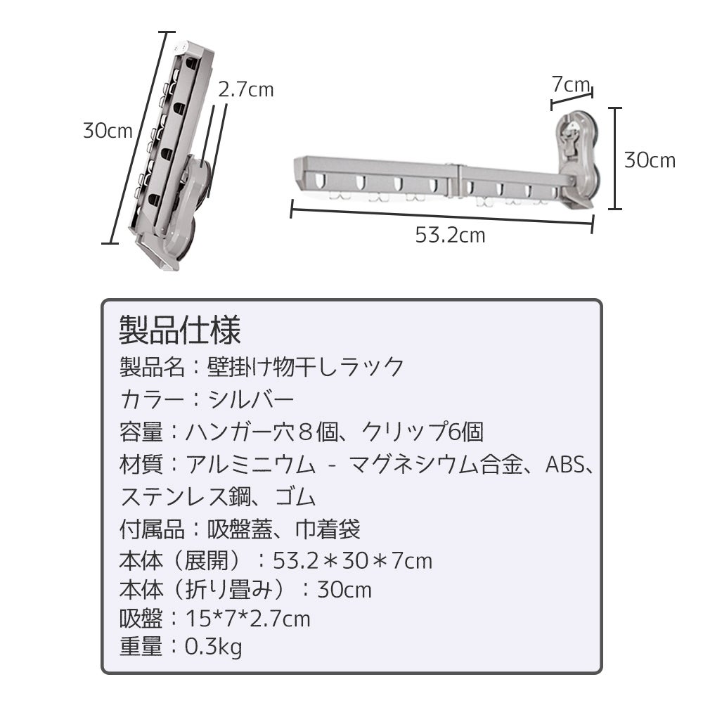 伸ばした長さ 53.2cm、ハンガー穴8個、クリップ6個