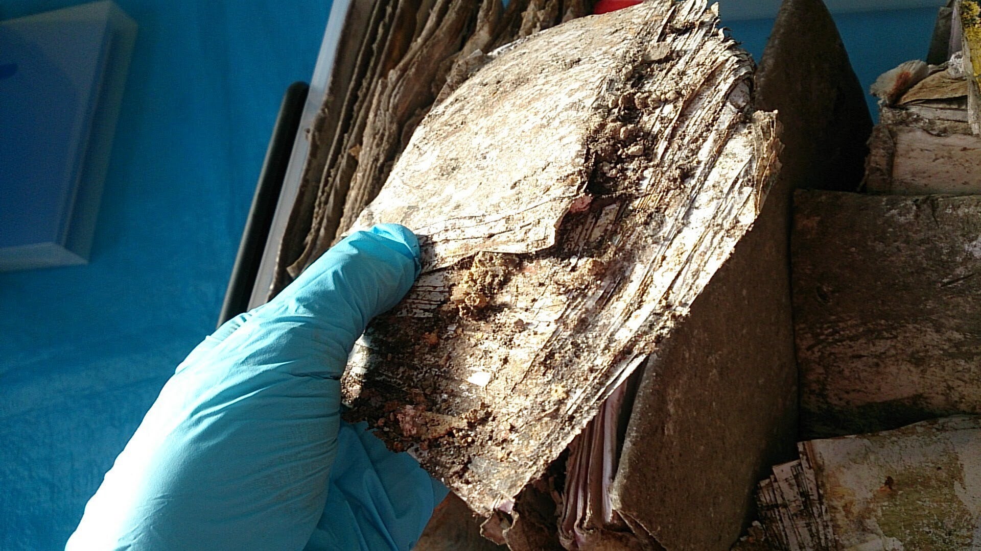 濡れてカビが繁殖して異臭を放っていた被災した資料です。(粘土や小粒の土砂を取り除いてます)
