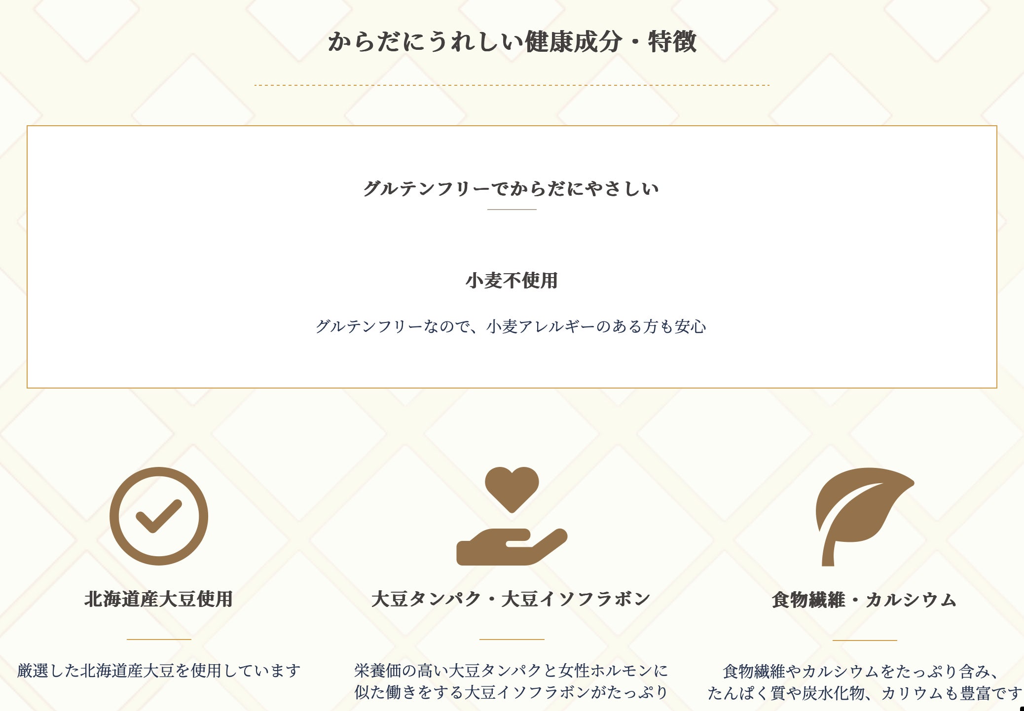 使用する原材料は、「植物性の原料のみ」「アレルゲン27品目不使用」「主原料は北海道産の大豆や米粉等」で、食物アレルギーの方やビーガン・ベジタリアンの方々等、いろいろな方に安心して食べて頂けます。(アレルゲン:大豆を除く)