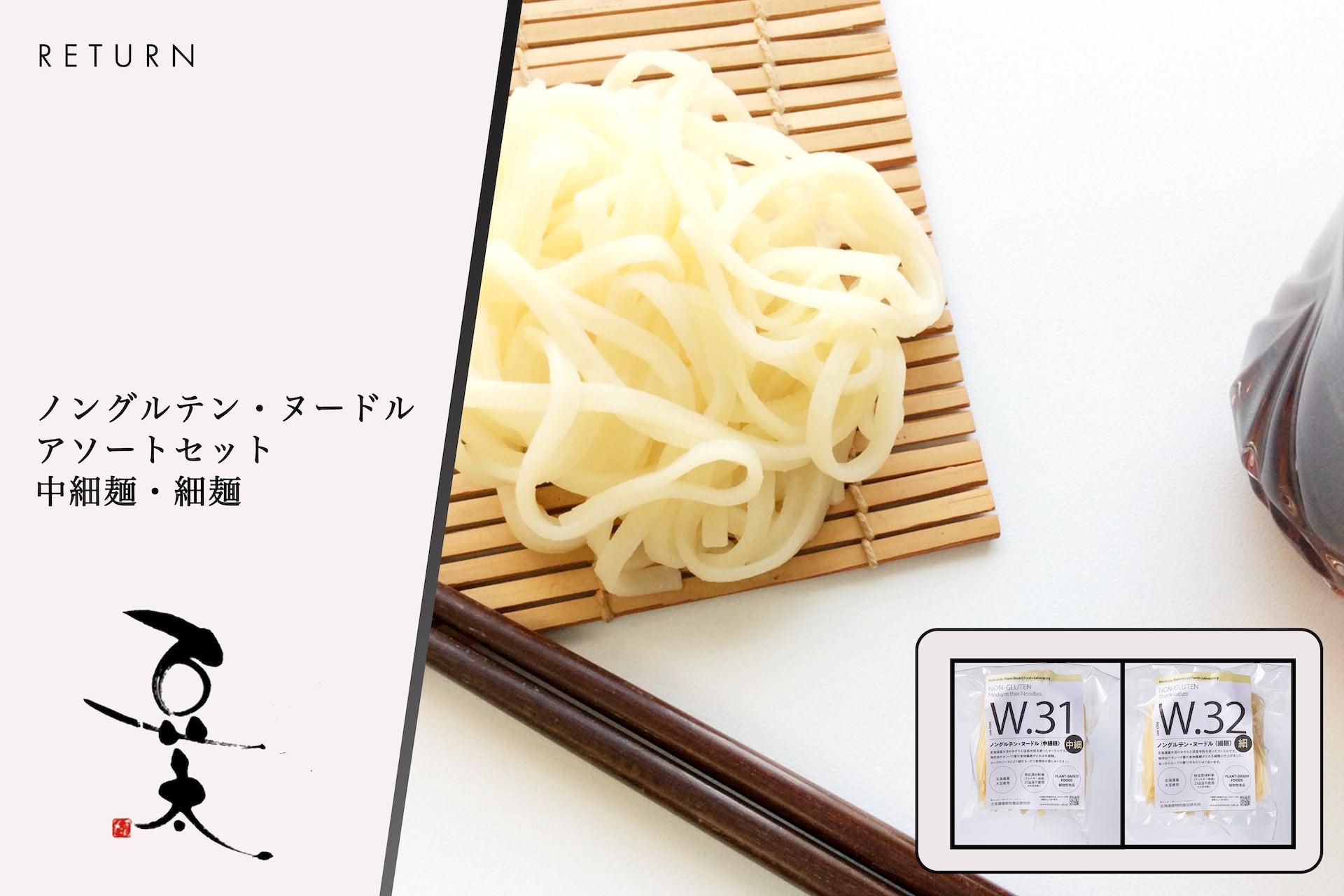 【ノングルテン・ヌードル/アソートセット】中細麺、細麺の2種類の組合せセット。パスタ、うどん、ラーメンとして美味しく召し上がれます。