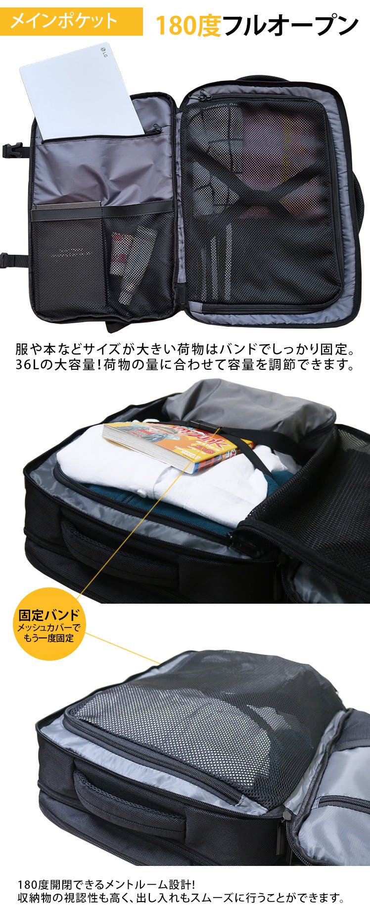1段:メッシュポケット、2段:メイン収納、3段:PC、タブレッド収納