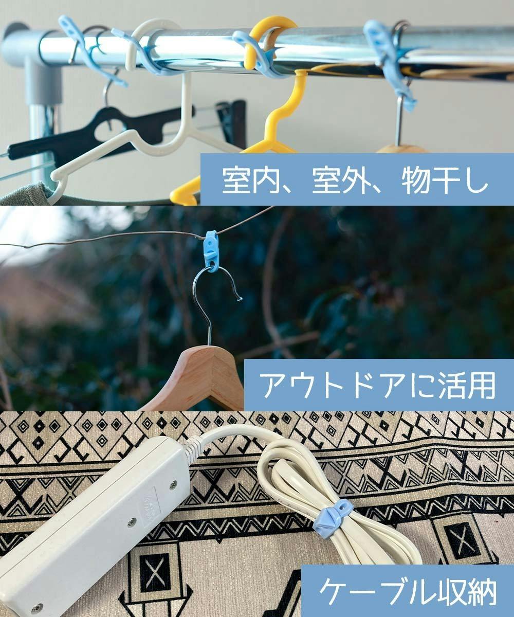 1, ハンガー360°ストップし、干し物の落下、風で飛ぶ心配不要!2, ハンガー横滑りやズレを防止し、干し物が距離を保ち乾燥しやすく、生乾き臭防止!3, ケーブルやイヤホンコードなどの収納にも役に立つ!収納グッズとして活用!