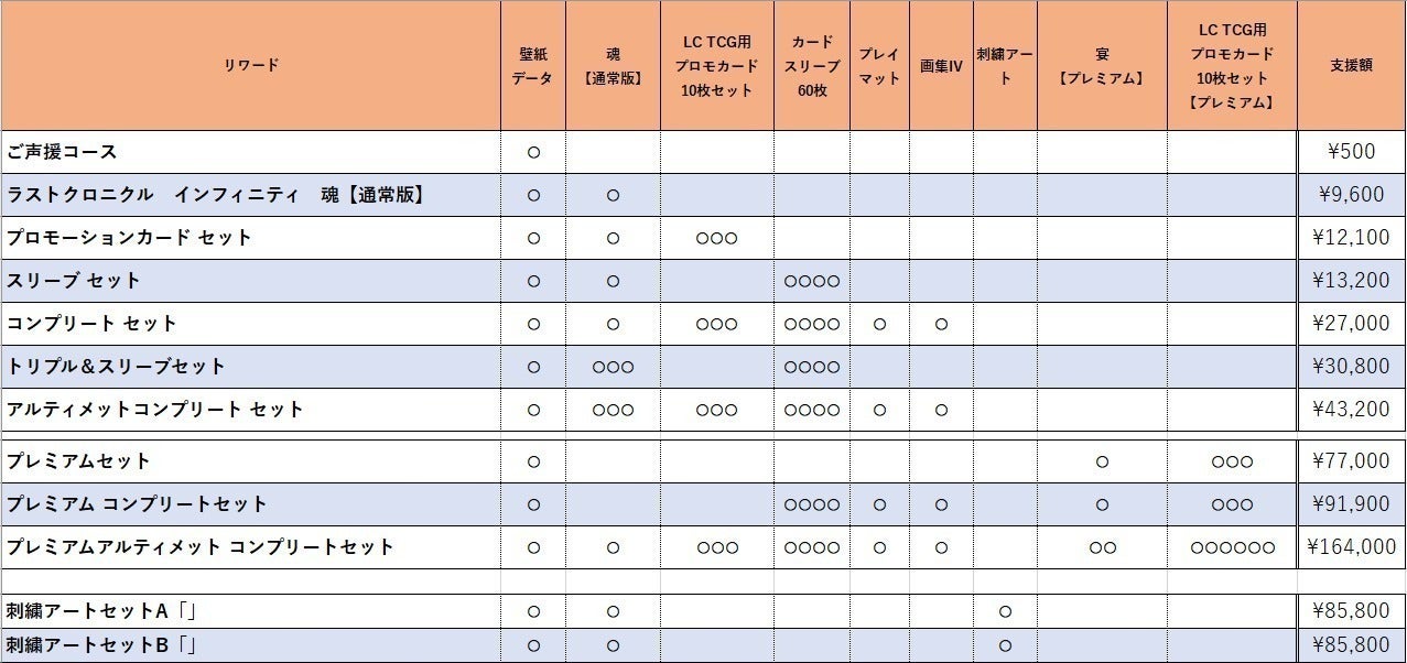 2.リターンに含まれるアイテム(特製壁紙データ、TCG「ラストクロニクル」用プロモーションカード各種、カードスリーブ、Art Collection IV、プレミアム版『ラストクロニクル インフィニティ 魂』)およびストレッチゴール達成の各アイテムは、一般流通での販売品には付属しません。