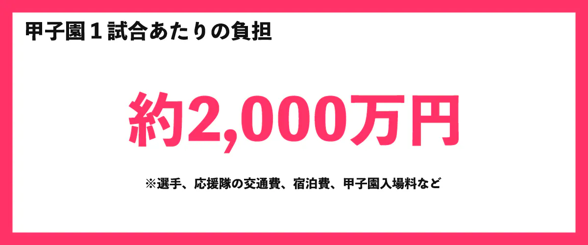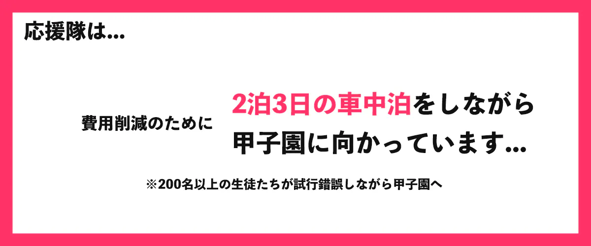 本州最北端の青森県から甲子園に出場するのには、1試合で約2,000万円ほどの費用が発生しています。仮に決勝まで勝ち進んだ場合を仮定すると、約1億円まで費用が膨らみます。甲子園でプレーする選手はもちろん、応援隊にも費用は発生します。200名以上いる応援隊1名あたりのコストだけでも1試合あたり約50,000円、これでも費用削減のために2泊3日の車中泊をしながら青森から甲子園までの道のりをバスで行き来している状態です。このように、白球を追いかける球児たちの憧れの晴れ舞台の裏には、限られた予算の中での試行錯誤が存在しています。