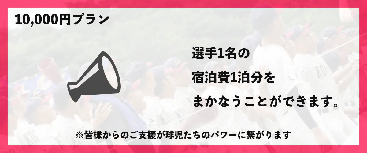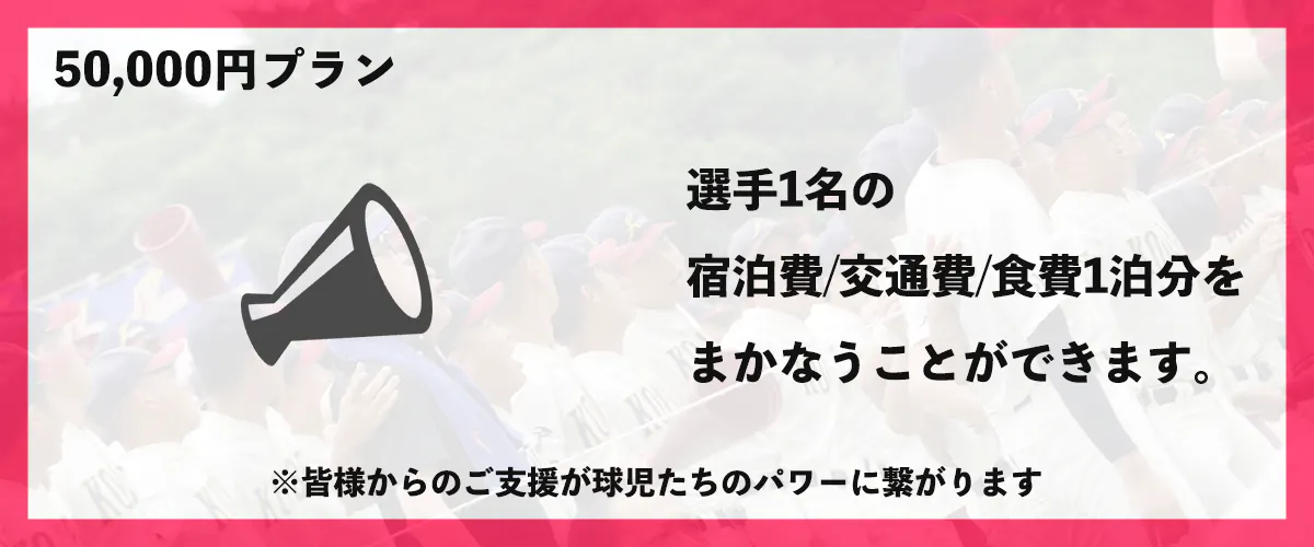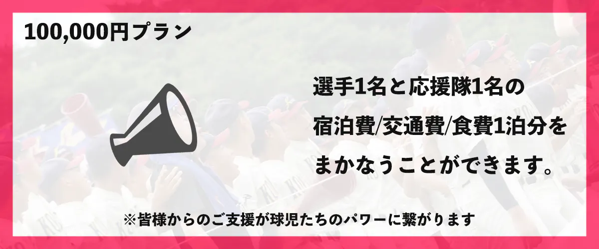 ※こちらのご支援で、選手1名と応援隊1名の宿泊費・交通費・食費(1試合分)をまかなうことができます。