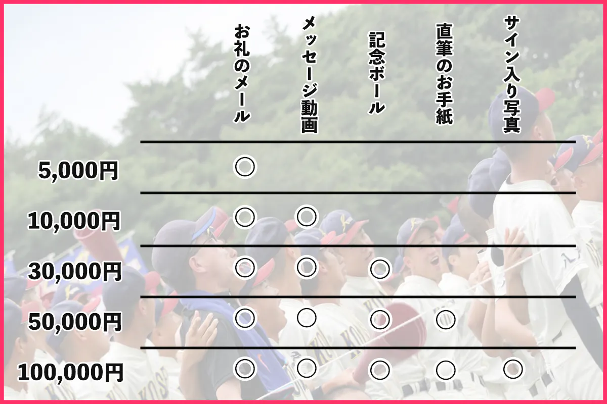 選手からのメッセージ付きのお礼メール、お礼のメッセージ動画、記念ボール、直筆のお手紙、サイン付き写真を送付させていただきます。