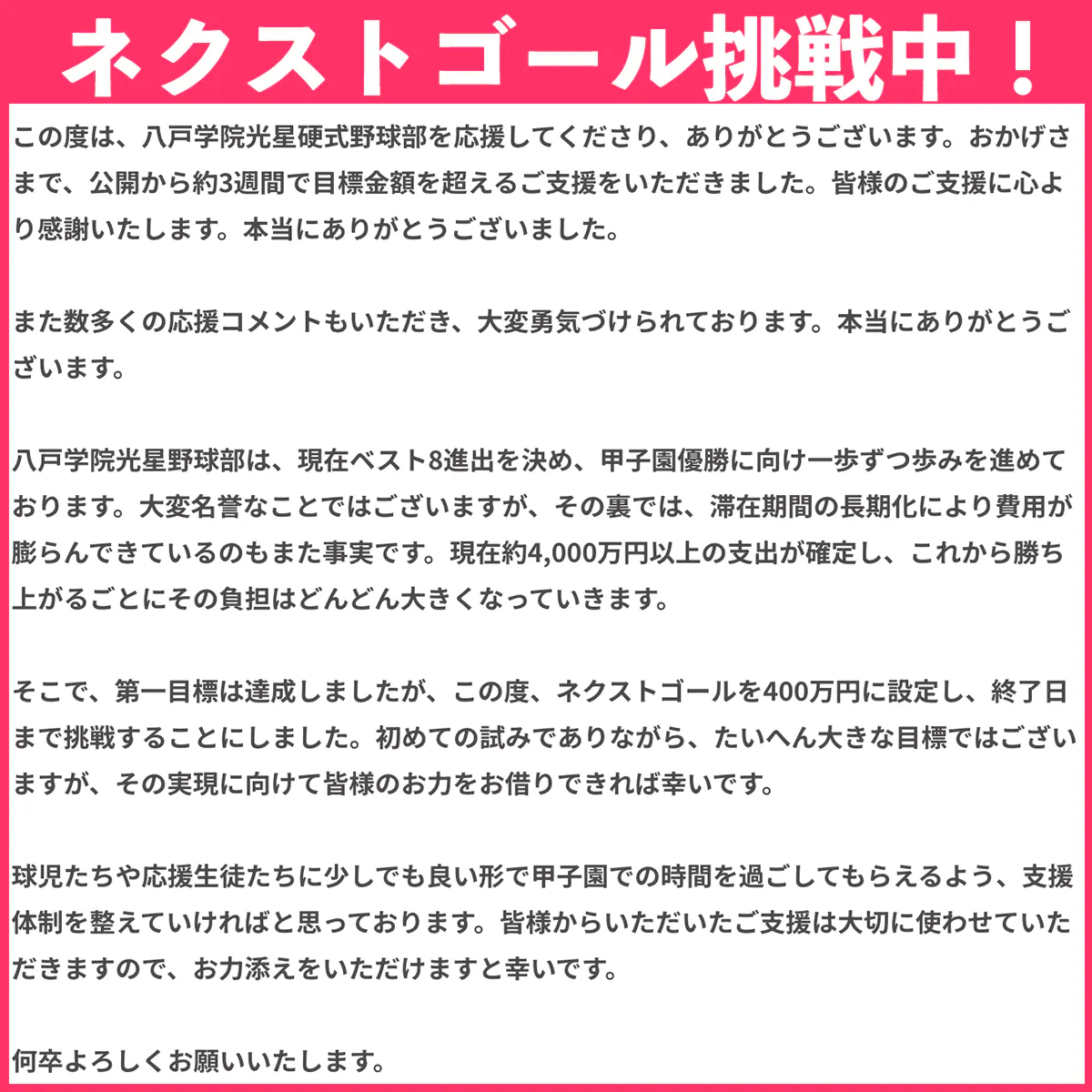 私たちが第105回全国高等学校野球選手権記念大会に出場を決定することが出来ましたのも、偏に皆様方のご支援の賜と改めて厚く御礼申し上げます。青森県代表として全国制覇に向かって挑戦し、本校の名誉と地域の皆様方のご期待に応えることができるよう、支援体制を整えたいと思っております。何卒お力添えを賜りますようお願い申し上げます。