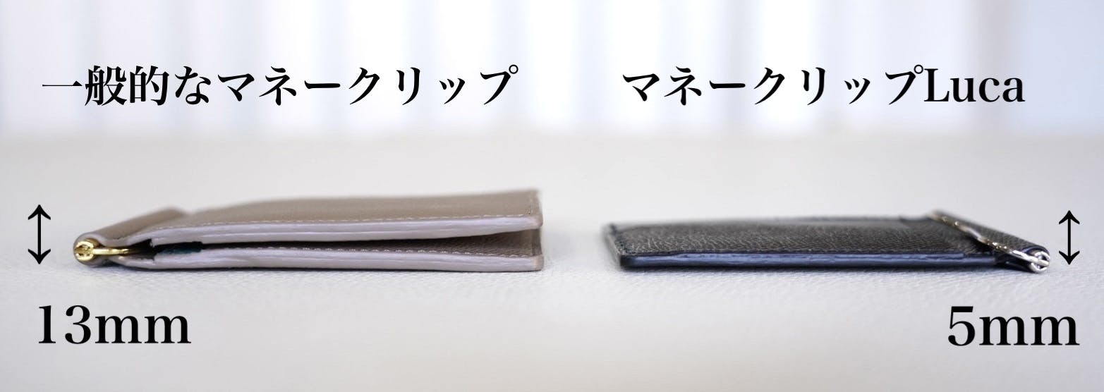 一般的なマネークリップは財布ごと折りたたむ為、厚みが発生してしまいます。