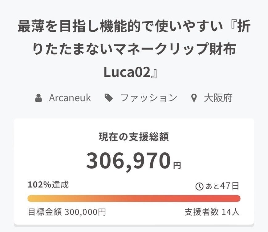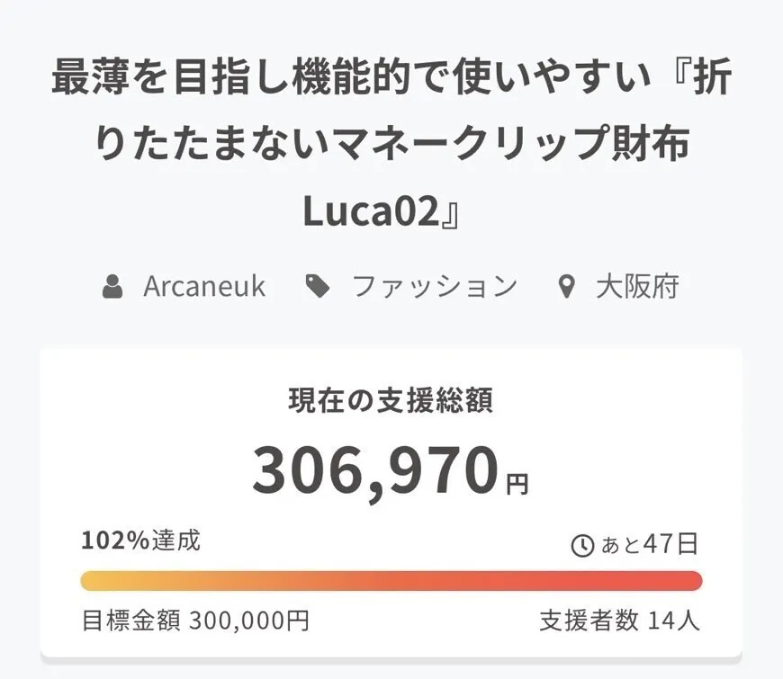 マネークリップ財布Luca(ルカ)02、開始5分で目標金額を上回るご支援をいただきました!