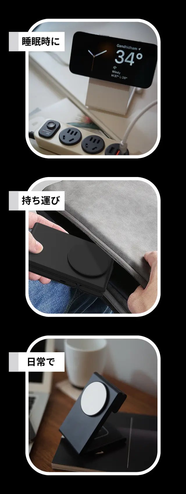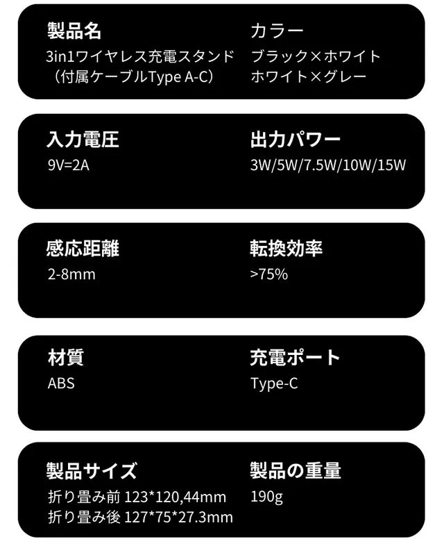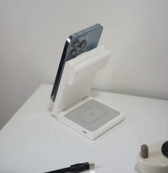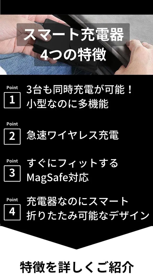 充電器を 1 つでも必要以上に持ち歩かなくていい。折りたたみ式でコンパクトなフォルムなので、ナイトスタンドやデスクにぴったり。手のひらサイズに折りたたむことができます。