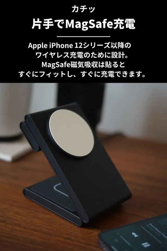 A. 2022.11月現在、以下に対応しています。iPhone:12シリーズ以降(12,13,14,15,Pro,Pro MAX)Apple Watch:2 シリーズ以降(2〜9)Air pods :AirPods pro※iPhone X〜11は平置きなら充電可能。(MagSafeがない為)
