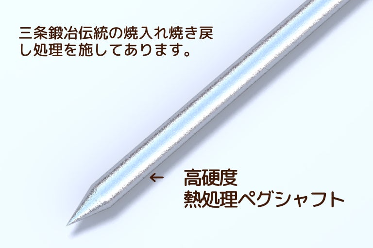 ハンマーで打撃を受けるペグヘッド部分には、柔らかめの軟鉄を使用することで、一般のチタンペグや鍛造ペグに比べて、静かなペグダウンを可能としています。