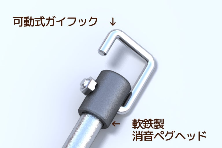 そして、ガイロープを掛けるフック部分を可動(回転)式として、地面にペグを完全に打ち込んだ後でもガイロープの付け外しを楽に行えるようにいたしました。