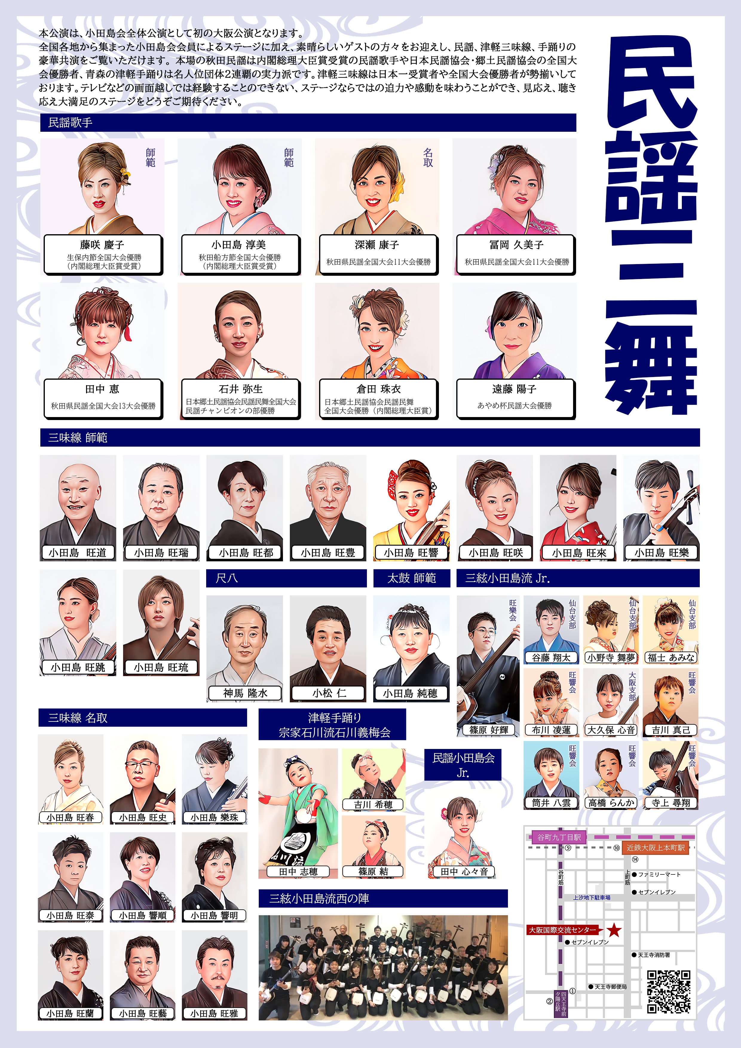 これまで三絃小田島流では西日本各地でライブ等を開催しておりましたが、この度は秋田小田島会も含めた「民謡小田島会」全体として初の大阪公演となります。