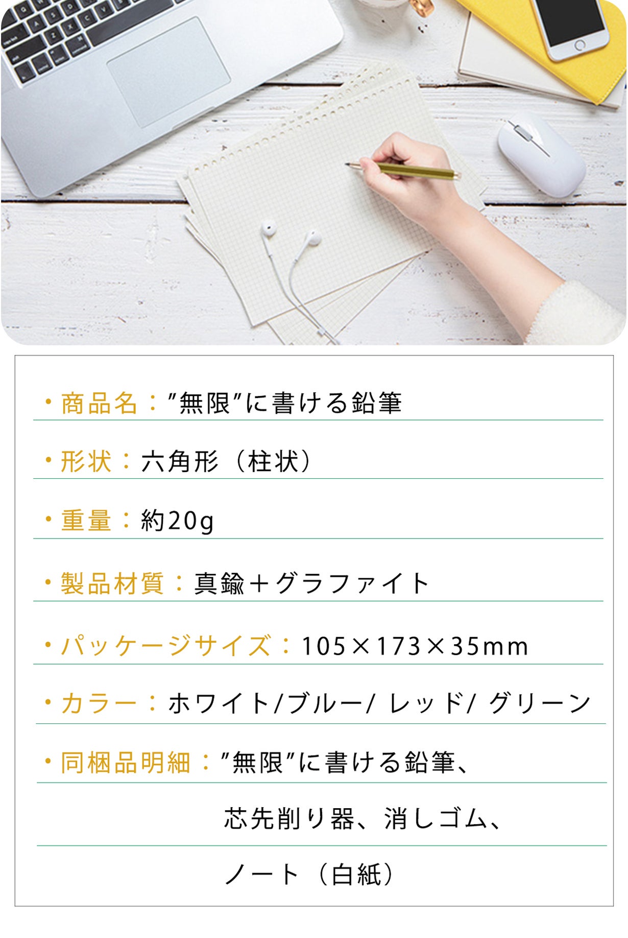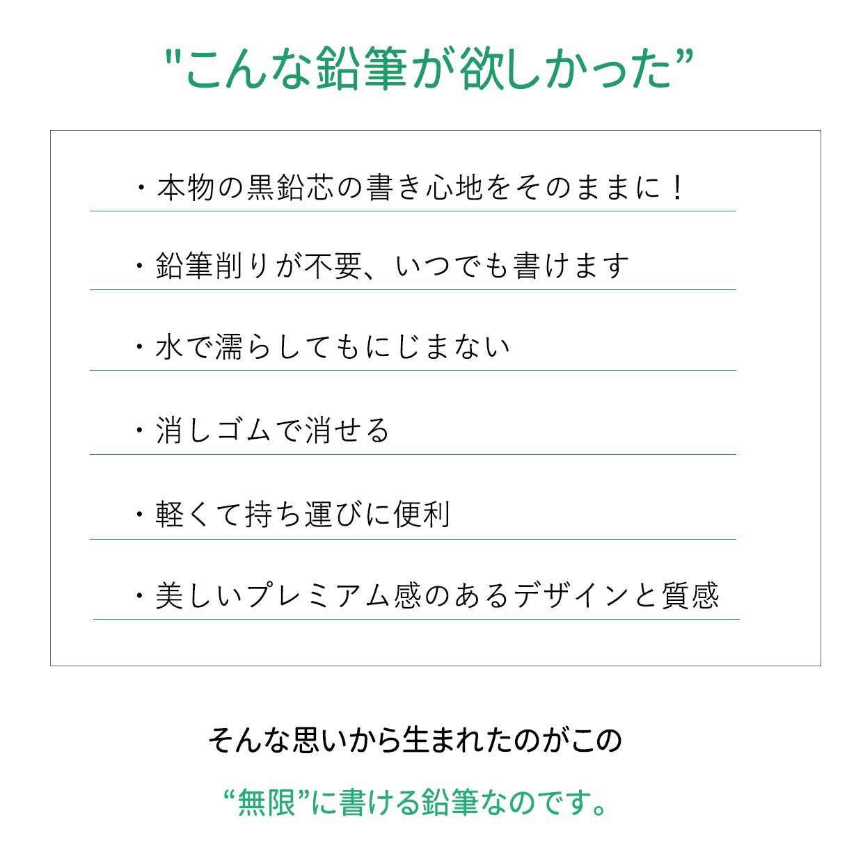 「書く」ことを、もっと楽しく、もっと手軽に、もっと環境に優しく、もっと快適に、長く愛用いただけるペン、それが“無限”に書ける鉛筆なのです。
