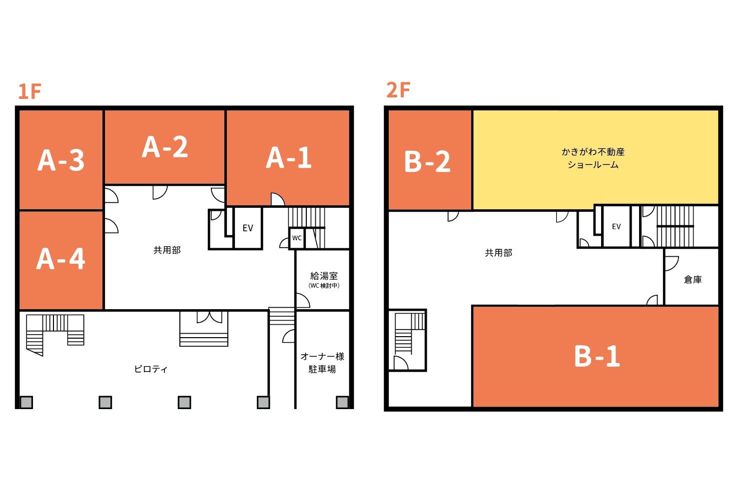 KAKIGAWA LIVING PARKには、1階に4区画、2階に2区画のテナントスペースがあり、あわせて6つのお店が入る予定です。