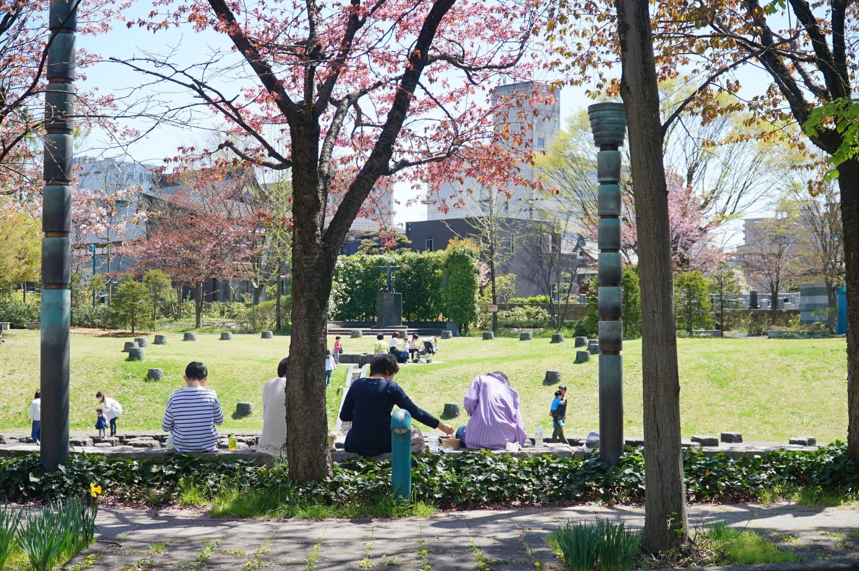 川のそばには緑が豊かな公園があり、小さい子どもからおじいさん・おばあさんまで、さまざまな人たちの憩いの場になっています。