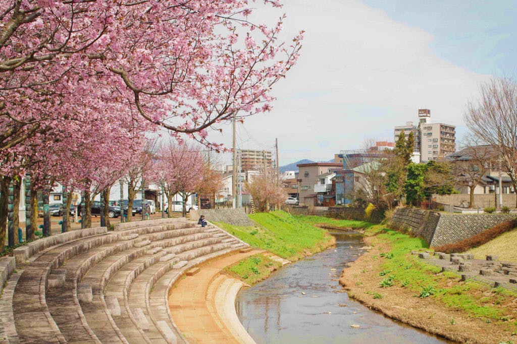 ゆっくりと柿川が流れ、川沿いではお散歩をする人やギターを弾く人、階段に腰かけてせせらぎを眺める人など、思い思いの楽しみ方をしている人が多くみられます。