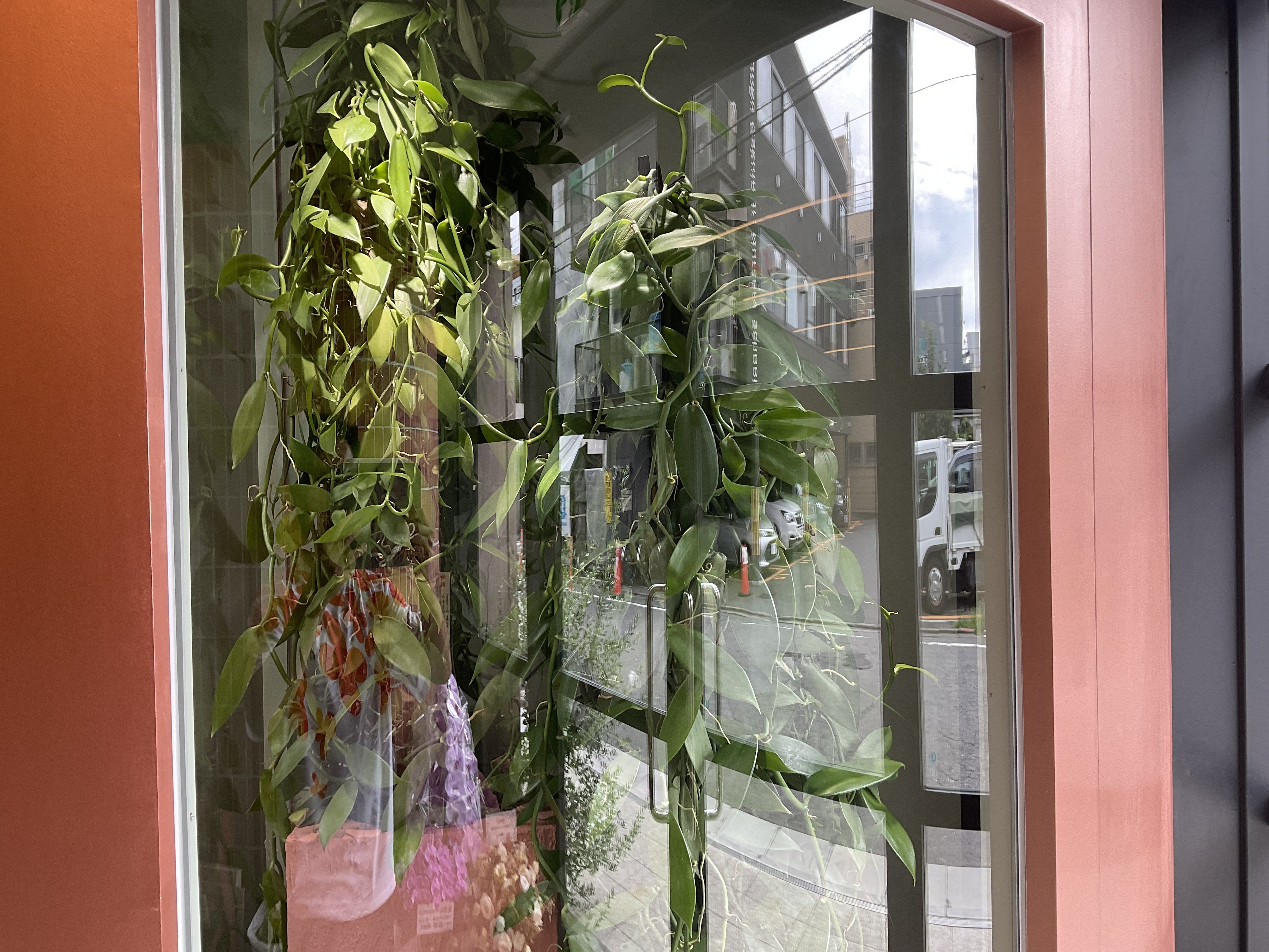 店舗の入り口のマダガスカルゾーン(と呼んでいます)に、バニラの木が到着しました。植物屋さんでも見かけることのないビジュアルは圧巻です。