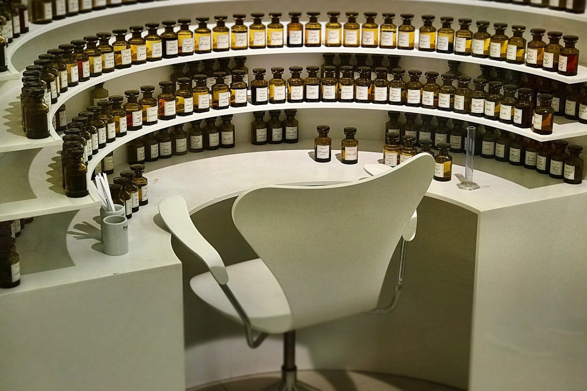 ラボパフューマリーは、花や木、果実などさまざまなものからエキスを抽出してクリエーションされる香水の多様性を表現するため、内装もさまざまな素材で表現された空間です。