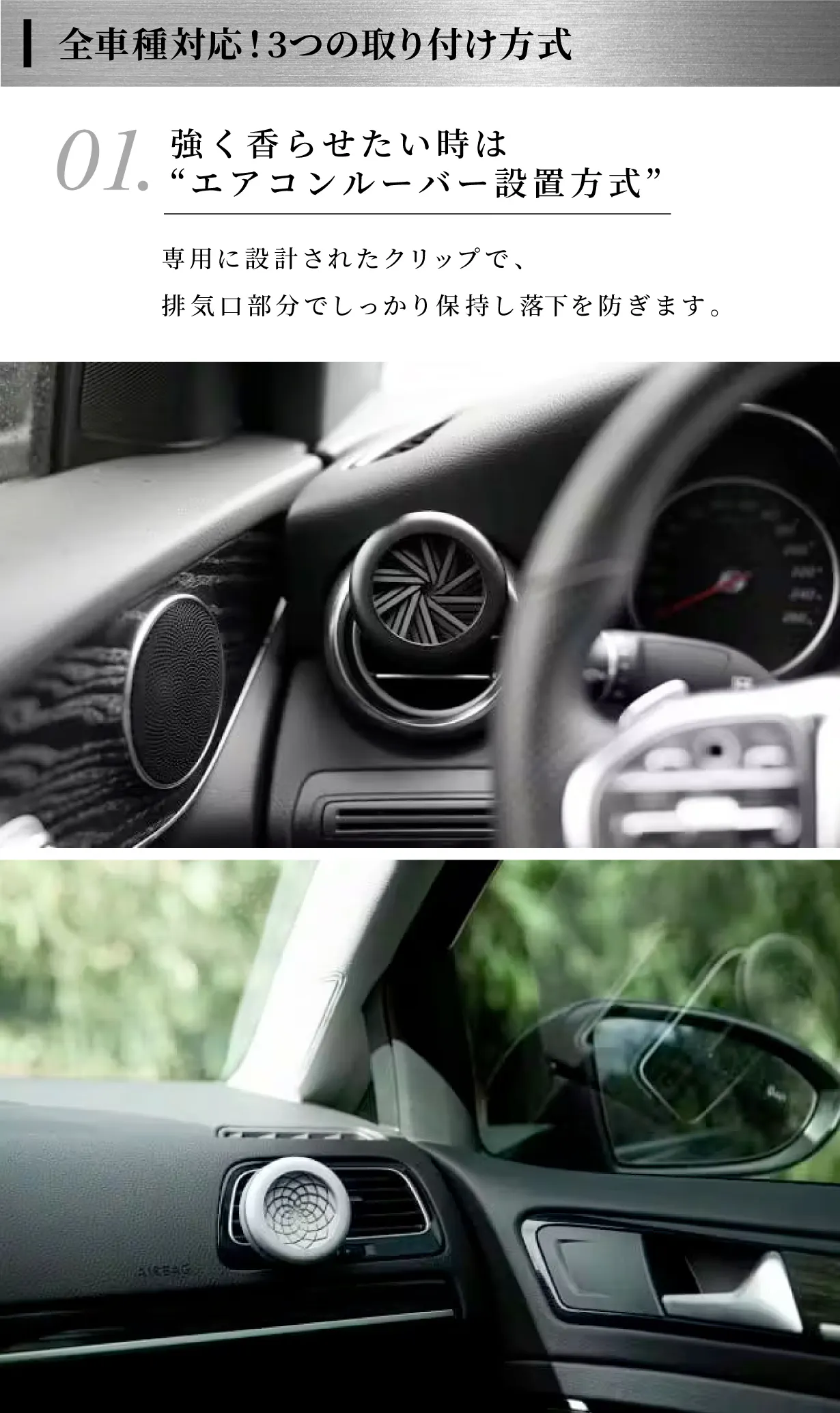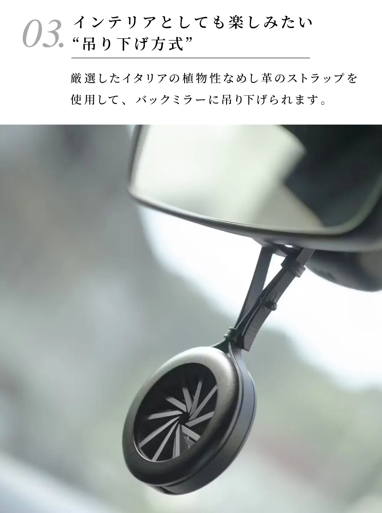 強く香らせたい時はエアコンルーバーやバックミラーに吊り下げる事で最高のドライブデート空間を演出できます。