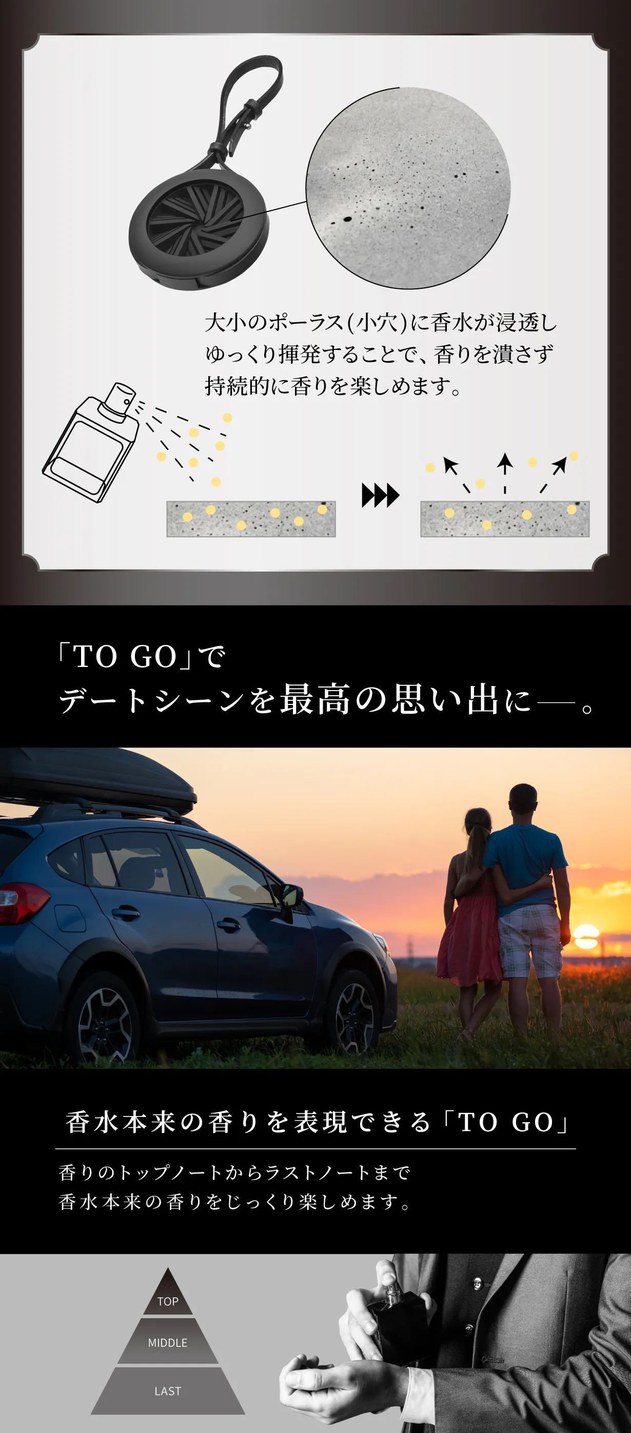 「TO GO」は香りを潰さずに拡散できるのでより香水本来のTop note, Middle note, Last noteを表現する事が出来ます。