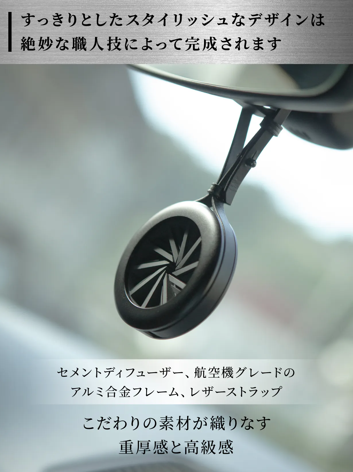 航空機素材のジュラルミンの削り出しとマット加工を施した高級感を醸し出すボディにセメントの無垢な質感が組み合わされた出来る男のカーディフューザーです。