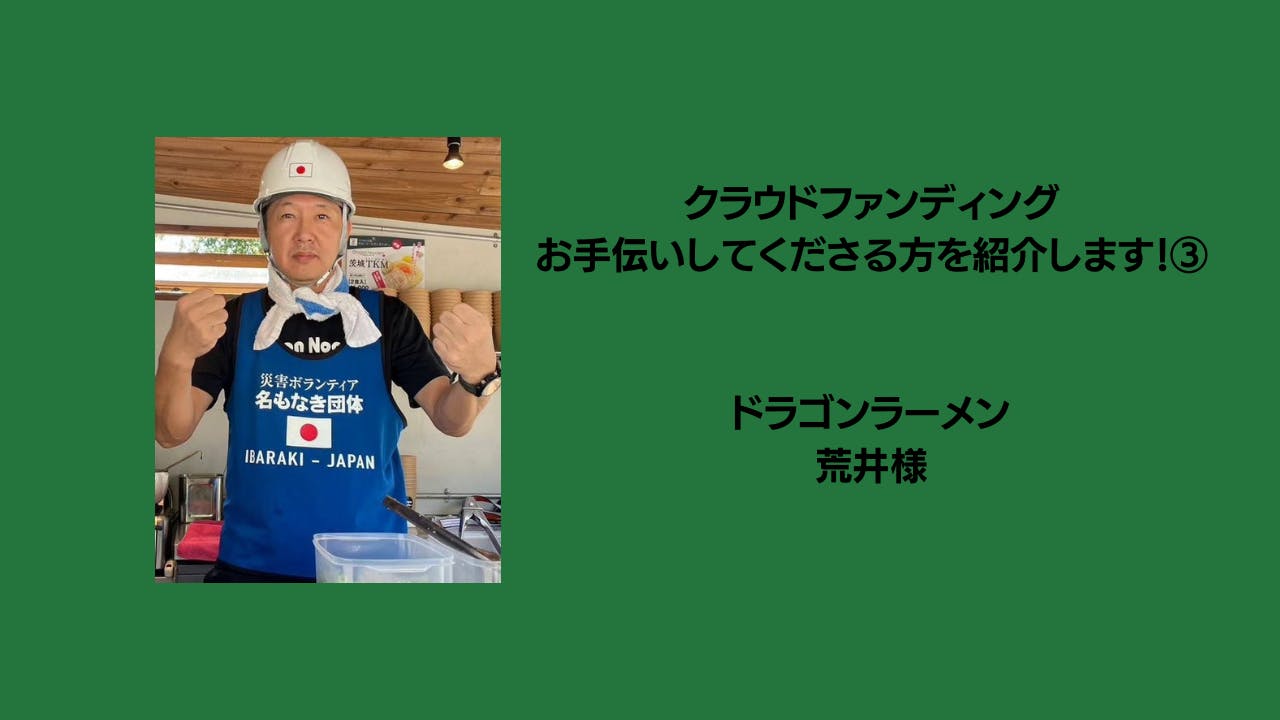 2023/12/04 20:00こんばんは!ドロールダイナー洋介です!今回でラストになります、「支援してくださったにも関わらずお手伝いプラン」にご支援頂いた方のご紹介です!本プランは4名の募集だったのですが4人目の方は、都合によりご紹介は無しとさせて頂きます。そして今回支援してくださった3人目の支援者は、、、、「ドラゴンラーメン 荒井様」もう、このプランの支援者の方、大御所の方が多すぎて私自身ヒヤヒヤしております( ̄▽ ̄;)初めてキッチンカーに乗せて頂き、ノウハウや知識、イベントなど教えてくださった私のお師匠様のような荒井さん。そんな荒井さんから今回のイベントの意気込みを頂きました!-----------------------------クラファン達成おめでとうございます。これがゴールではなくてここからボランティアのスタートなので、支援してくれた皆さんのお気持と美味しいハンバーガーを子供達に届けましょう!そして飲食業の素晴らしさを伝え一生の思い出に残るような最高の時間にしましよう。微力ながら出来る限りの協力をしたいと考えてるのでご一緒によろしくお願いします。今から楽しみです!-----------------------------ありがとうございます。次回はなんと「日程決定!」お楽しみに! もっと見る