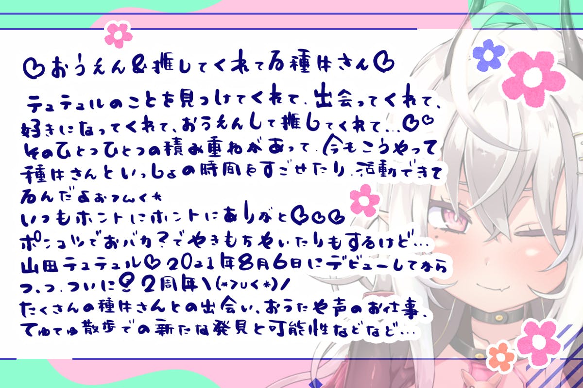 この2年間の活動でリスナーさんとお話すること、歌うことがさらに好きになり、配信を重ねるにつれ、応援してくれる方、観てくれている方に、もっと楽しんでもらいたい!もっと感謝を伝えたい!もっと山田テュテュルを知ってもらいたい!という想いがとても強くなりました。