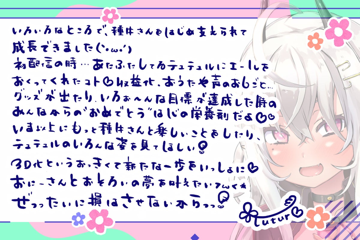 このプロジェクトは、デビュー当初からのテュテュルの夢だった通常衣装の3Dモデル制作に加え、さらに刺激的にみんなを虜にする差分ボディを高クオリティで作り込み、3Dモデルでの生歌LIVE、ありのままのテュテュルでの3D LIVE配信を目指し、さらに活動の幅を広げみんなと一緒に歩んでいきたい!そう考え立ち上げました。