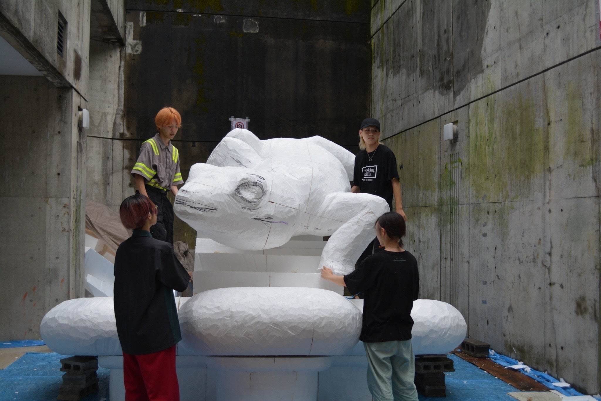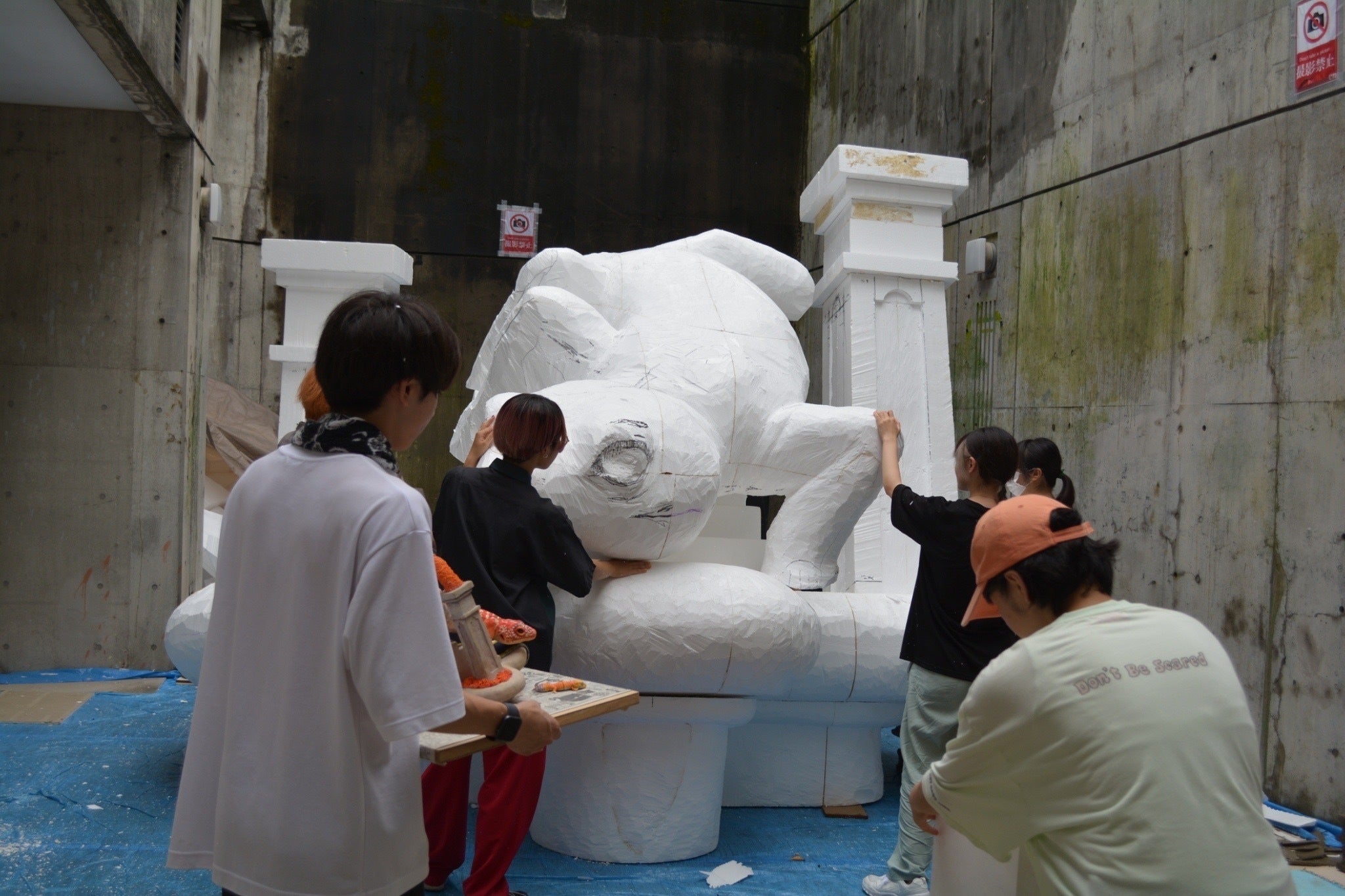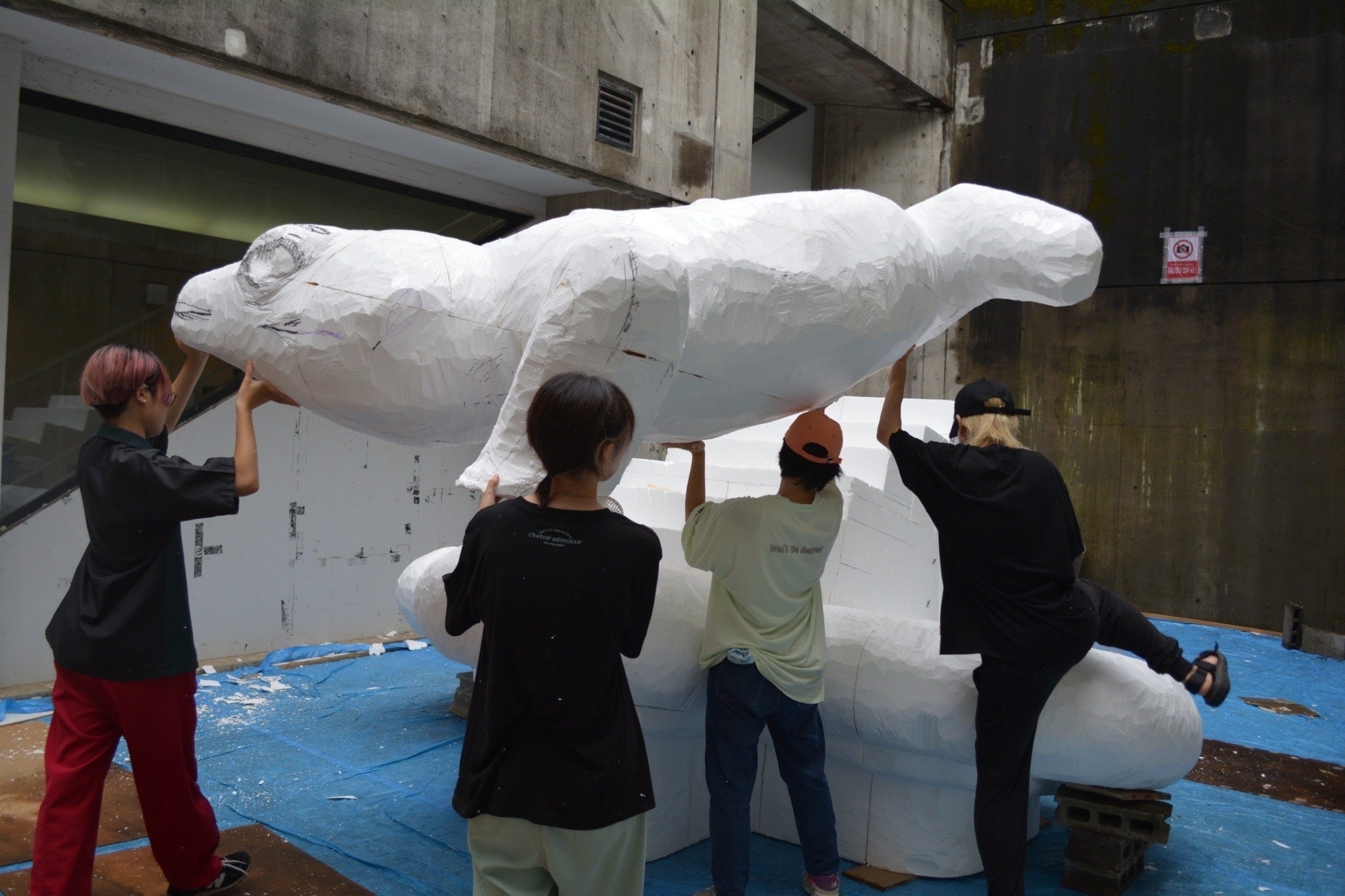 やもりを数人がかりで土台に乗せます。