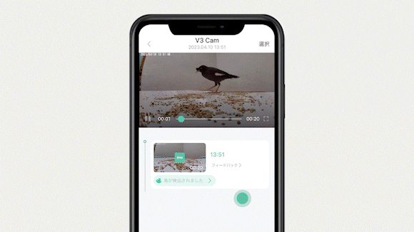 「V3 Cam」にお任せください!AI認識機能が搭載され、専用アプリ「VicoHome」を使って、鳥の動きをリアルタイムで観察・認識することができます。