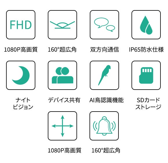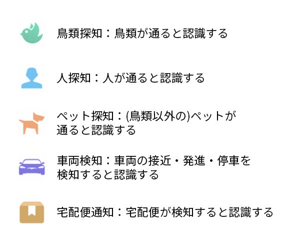 ●鳥・人間・ペット・車・宅配便、5種類の探知認識機能を搭載