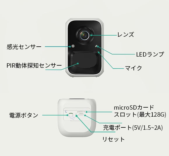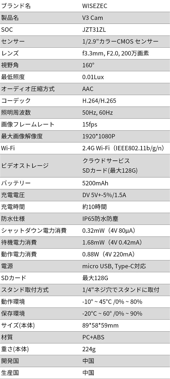 「V3 Cam」は5200mAh大容量バッテリーが内蔵しており、1回のフル充電で、最大6ヶ月ご利用いただけます(1日あたり10秒の動画を20本録画する場合)。