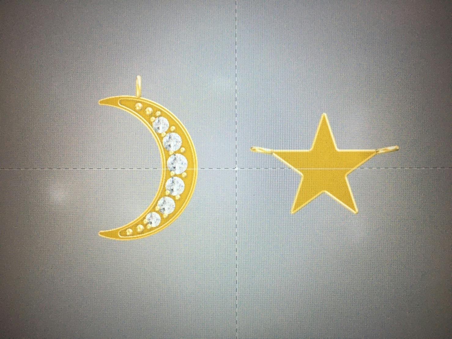 太陽の光を反射して光る月と星をネックレスにしました。2つのモチーフが首元を美しく輝かせてくれます。