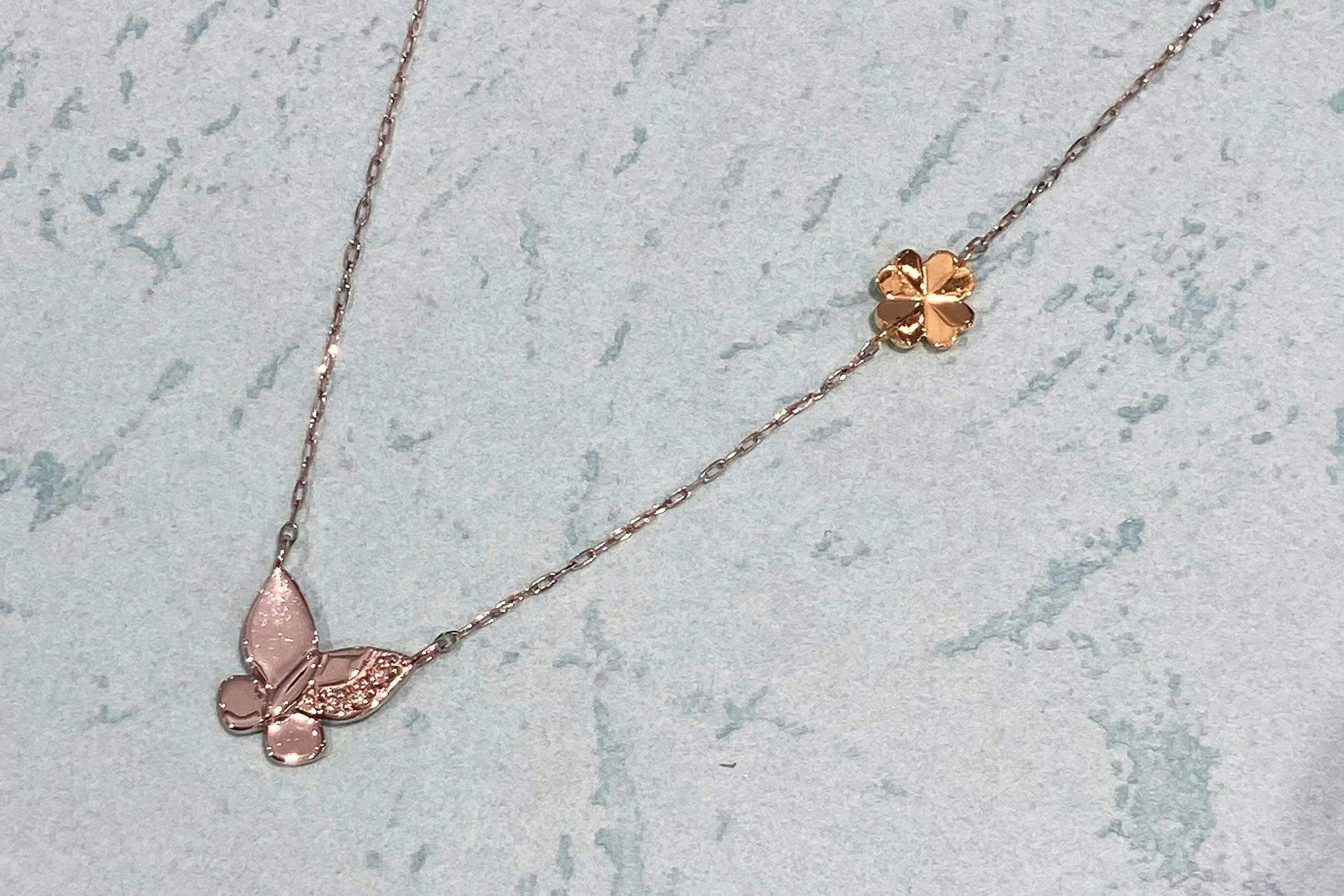 クローバーのお花畑でひらひらと舞う蝶をネックレスにしました。2つのモチーフが首元を華やかにしてくれます。