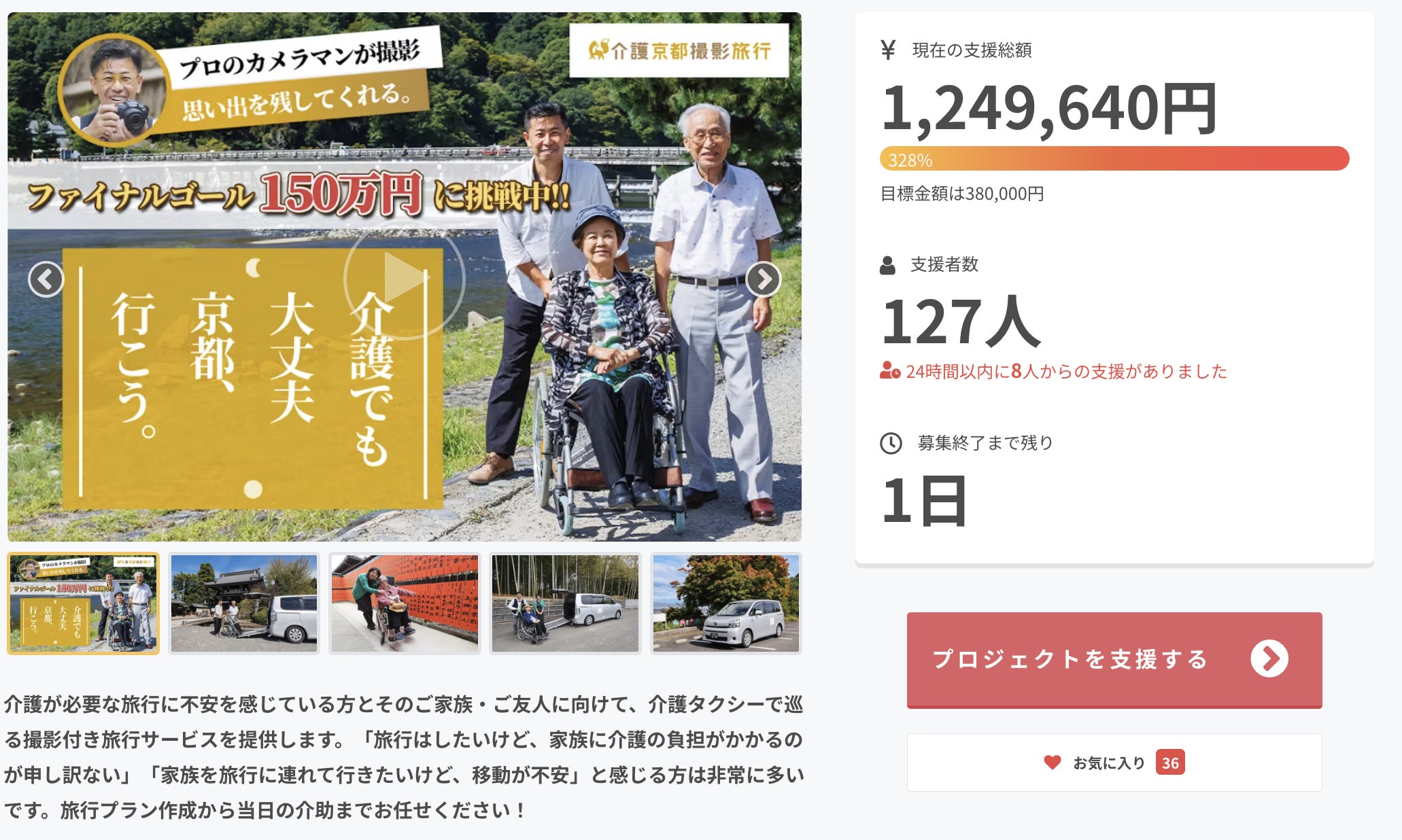 このたび新たな挑戦として、介護と旅行と撮影の融合サービス「介護京都撮影旅行」を始めることにしました。その足掛かりとして、多くの方にサービスを知ってほしく、クラウドファンディングに挑戦します。