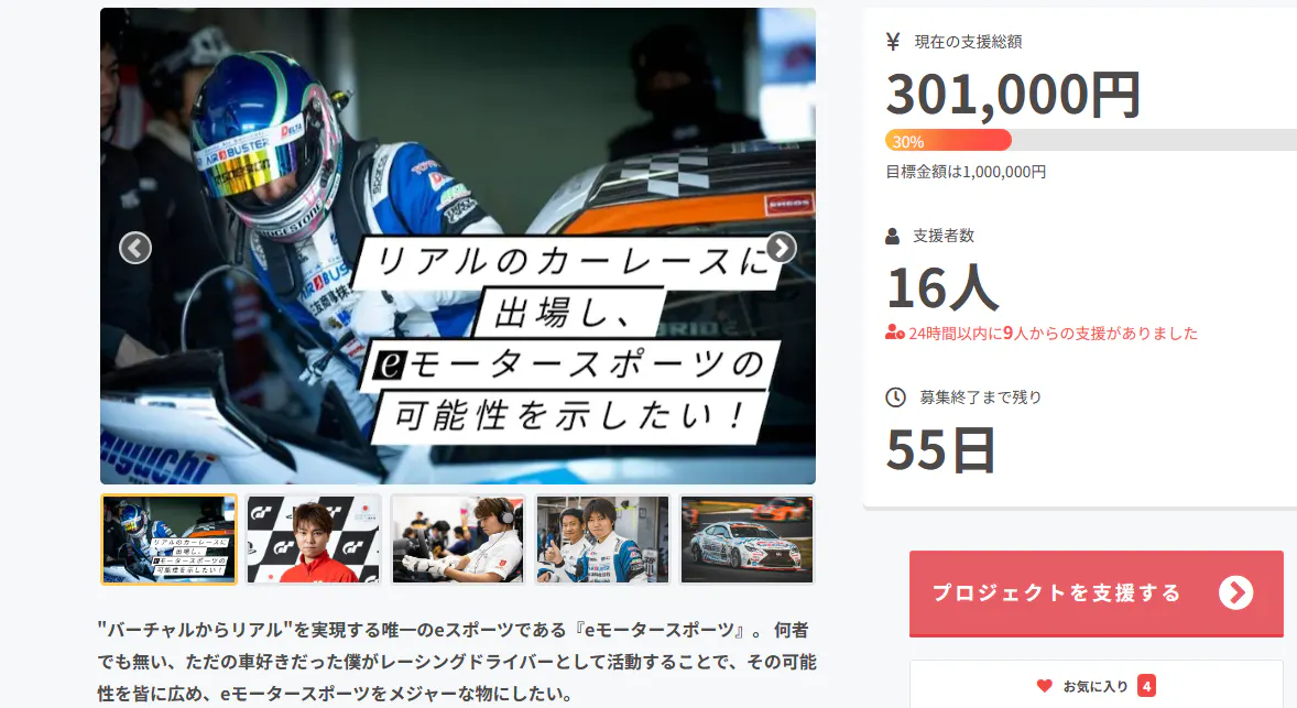 ちなみに現在の一番人気の商品は、リターンが感謝のメールとレースレポートという『ただただ支援エボⅠ』 コース。