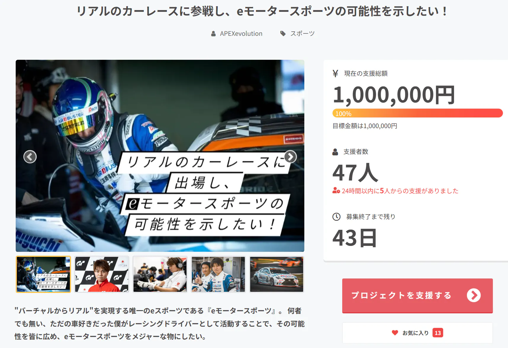 この金額を「ネクストゴール」として設定し、まだまだこのクラウドファンディングと僕の活動を広め、eモータースポーツを広める活動の一つとして、そしてレースができるように、引き続き取り組んでいきたいと思います。
