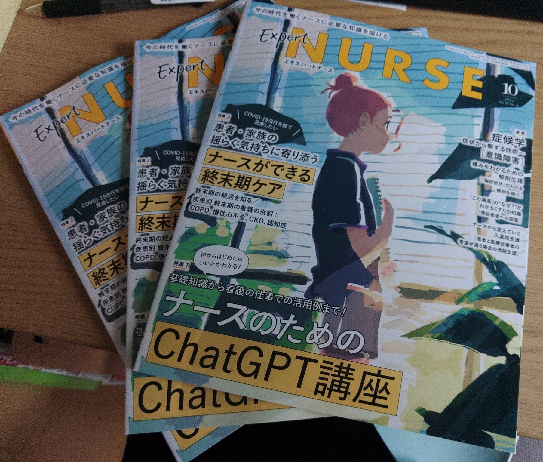 照林社発行の『エキスパートナース2023年 10月号』(発行部数:10万部)で、特集記事「ナースのためのChatGPT講座」を執筆させていただきました。