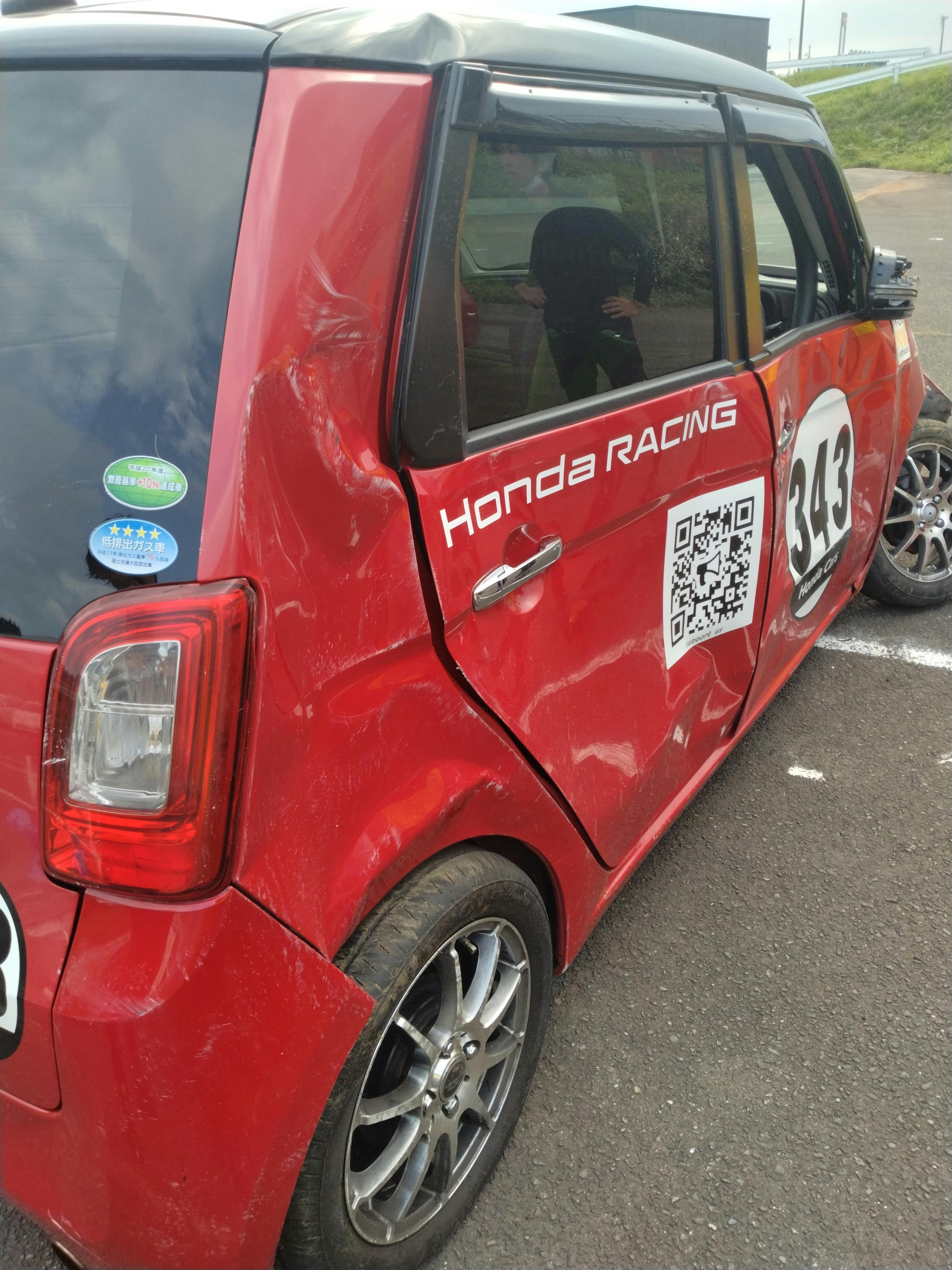 練習中、赤い方の車両がスピンし壁に激突し大破してしまう事故が起きてしまいました。