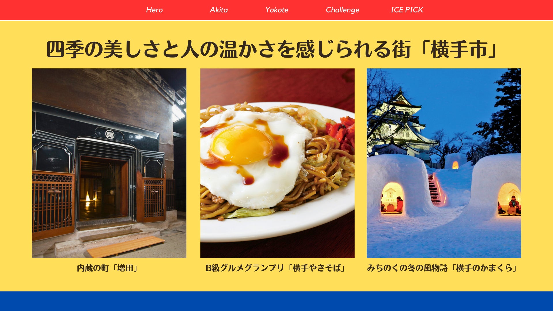 横手市は、秋田県の県南部に位置し、人口83,400人(令和5年4月末時点)を有し、四季の美しさと人の温かさを感じられる街なんだ。自慢はたくさんあるぞ!秋田県内でも有数の穀倉地帯でありお米の産地なんだ。加えて、りんごやぶどう、さくらんぼなど安全で美味しい農産物も豊富だぞ!また、ご当地グルメの祭典"B-1グランプリ"でゴールドの受賞実績のある「横手やきそば」は全国的にも知名度が高いグルメなんだ。