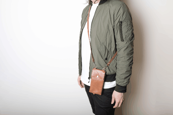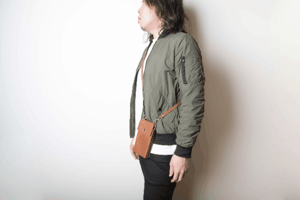 ストラップを体にフィットする長さに合わせて、サコッシュのように身軽に持つことが出来ます。スマホポーチならではの取り出しの良さを感じていただける持ち方です。
