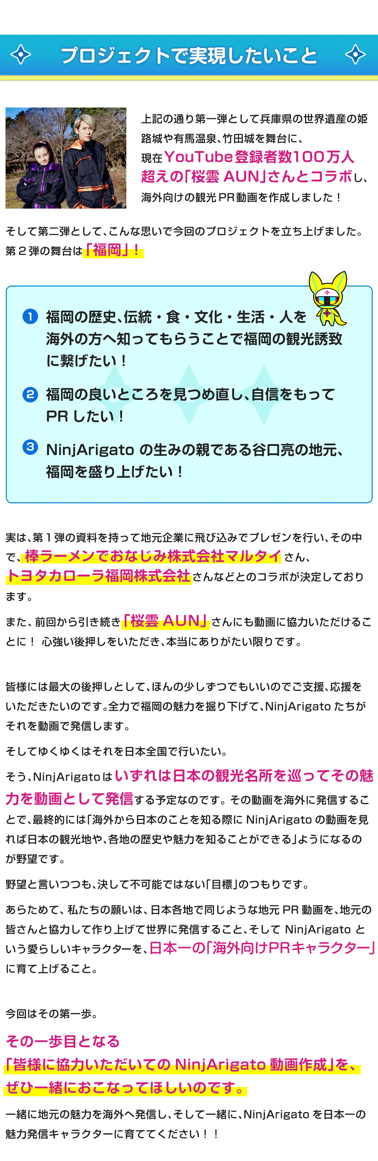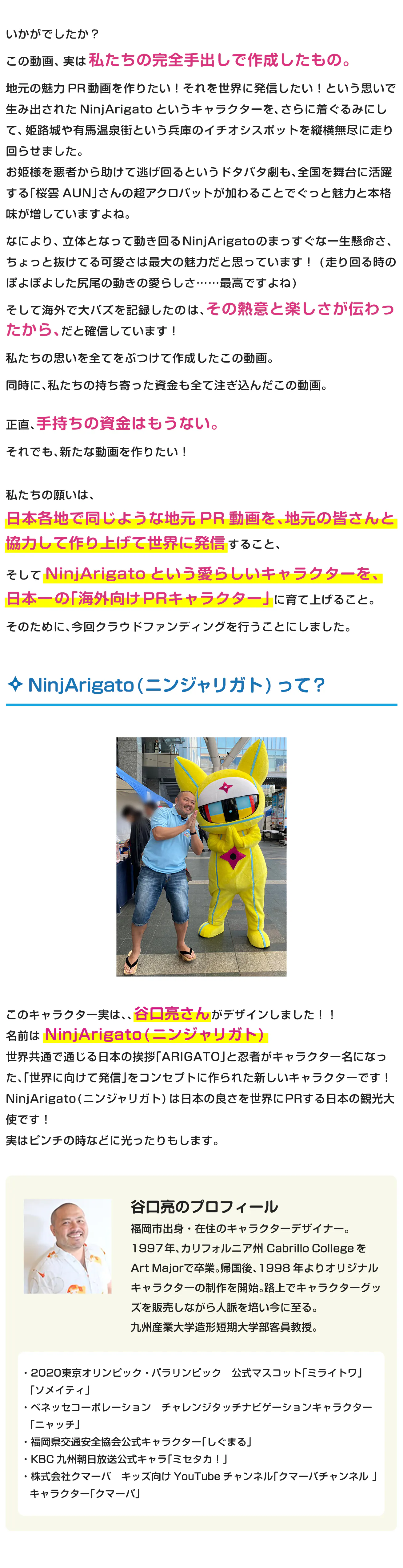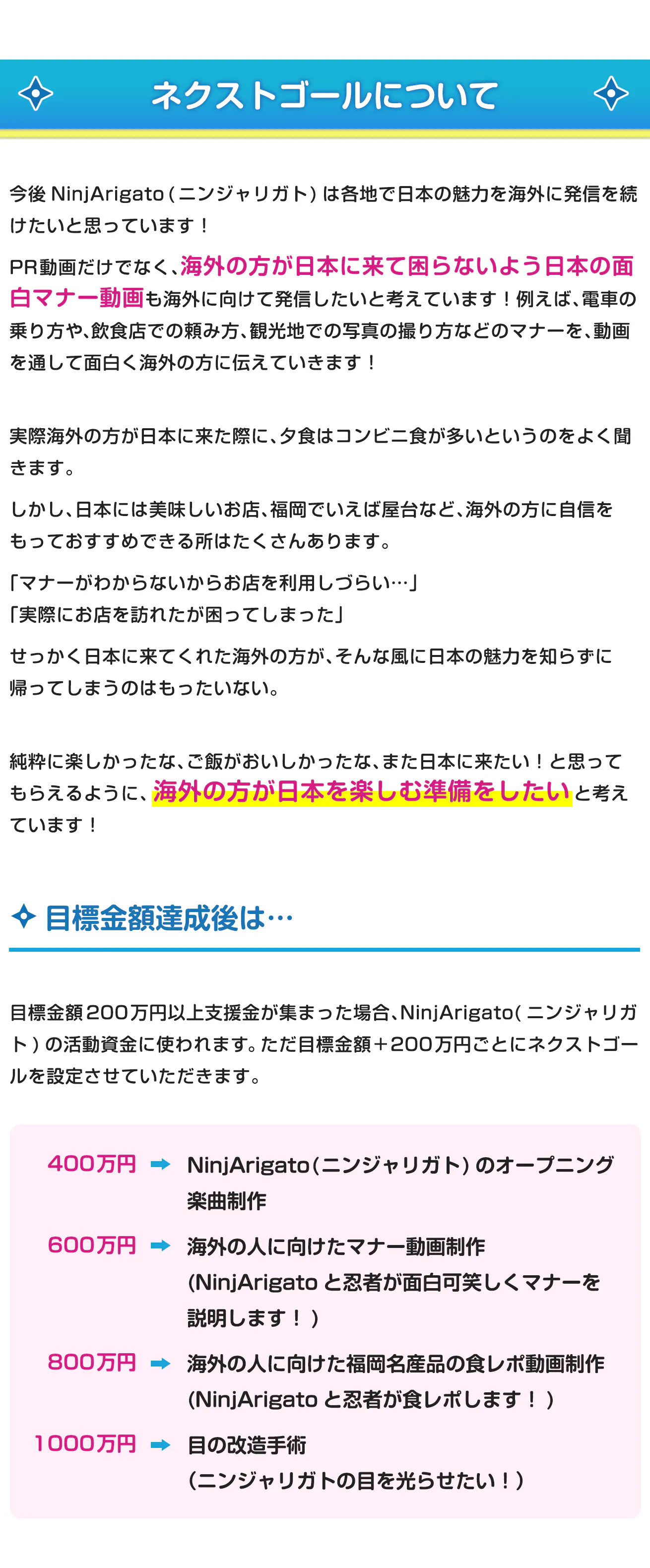 いずれ「NinjArigato(ニンジャリガト)を応援してよかった」と皆さまが誇れるようなキャラクターを目指していきますので、