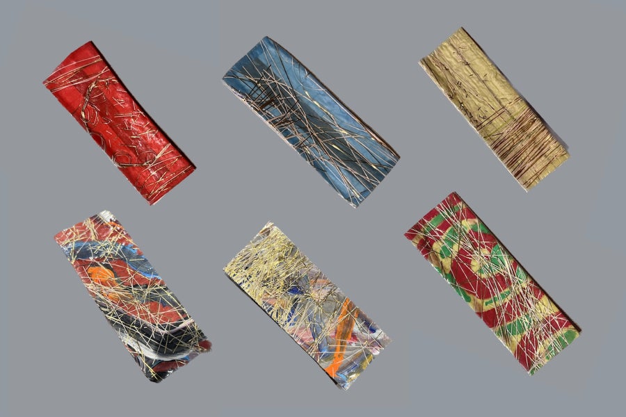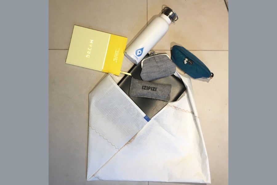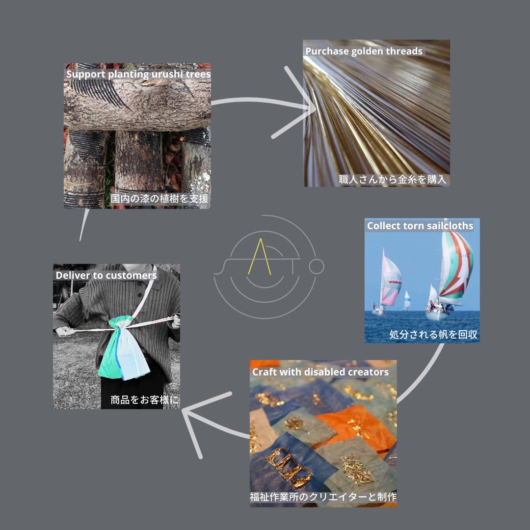 海での役目を終えたヨットの帆などの廃棄されてしまう生地と金糸を掛け合わせ、