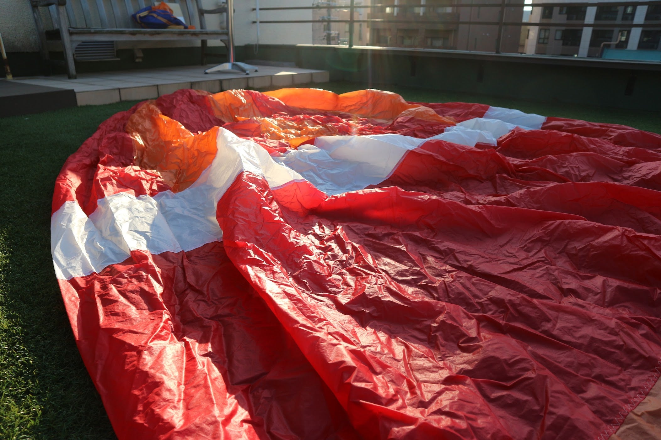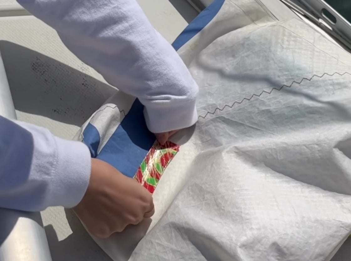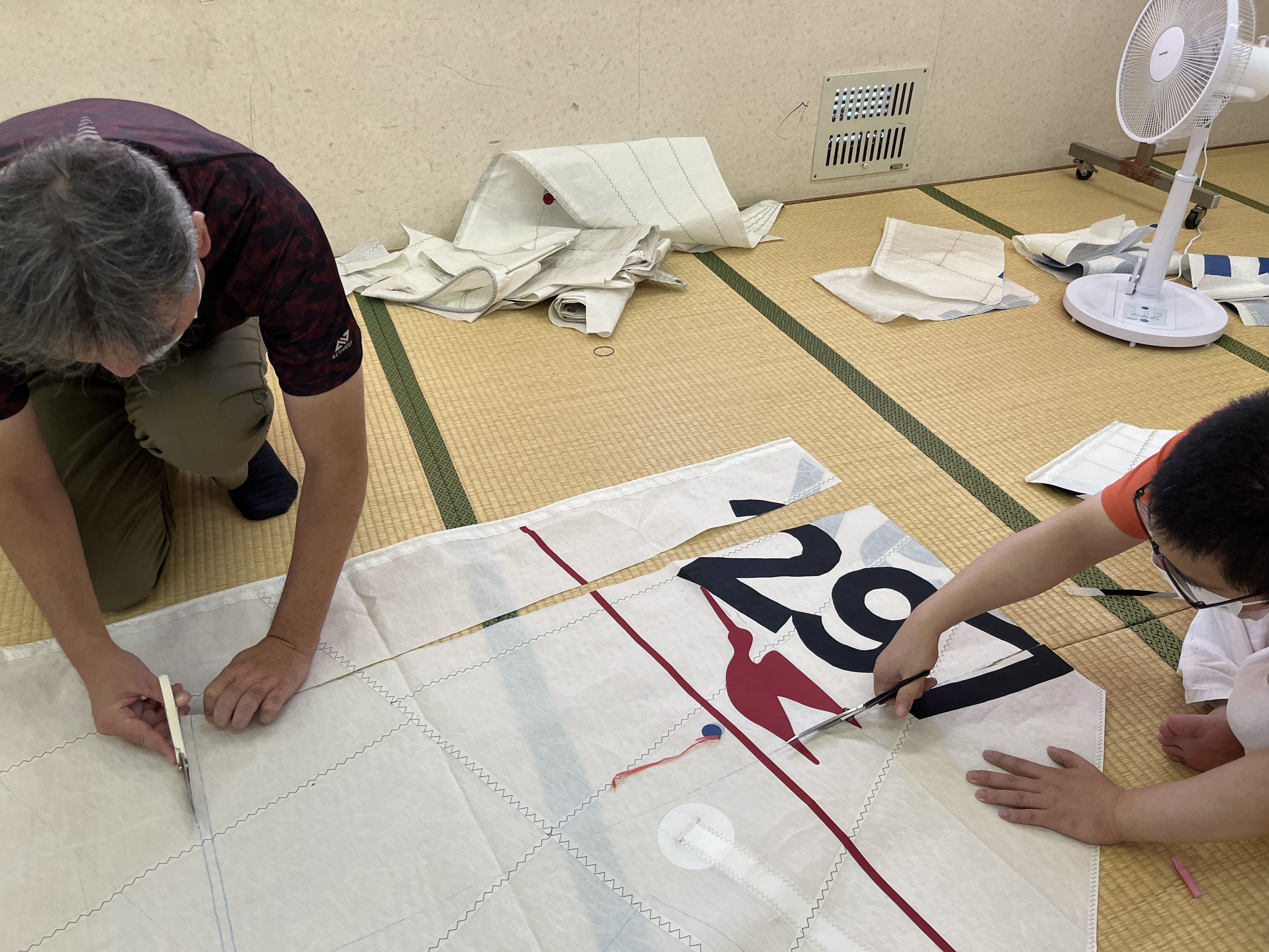 追い風の時にだけ使う「スピン」という軽くてカラフルな種類の帆です。最近はヨットの帆以外にも他のアパレルブランドさんの端材をお譲りいただき、